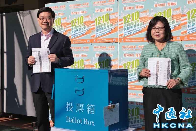 香港新聞網12月10日電 (記者 陳卓儀 陳偉根 )12月10日是香港區議會選舉投票日,城中政商等界知名人士當天踴躍投票,並在現場和社交平台呼籲共創美好社區。 當天上午,香港特首李家超和多名政府官員,早早投票。李家超與太太當天約9點到位於半山的票站,吸引大批傳媒到場拍攝。他投票後向在場媒體重申區議會選舉的重大意義,這是完成落實“愛國者治港”的最後一塊拼圖。