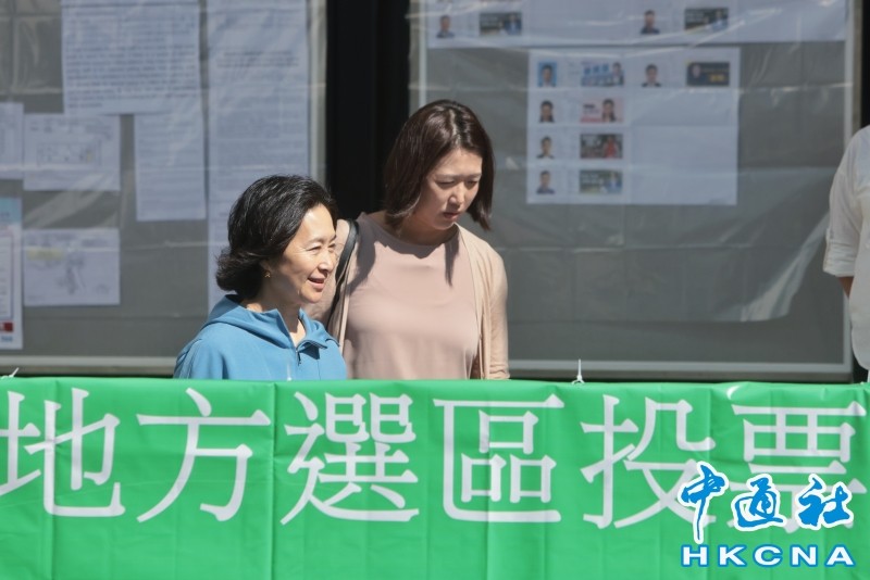 藝人甄子丹和太太汪詩詩在西環投票。香港中通社圖片 全國政協常委何超瓊身穿運動外套現身山頂一個票站。她投票後向傳媒展示現場派發的心意謝卡,並表示投票非常順利。早上看到很多人投完票後,還在不停呼籲投票,這是香港的新現象,以和平團結的心態,選出真正為香港做好事的人。