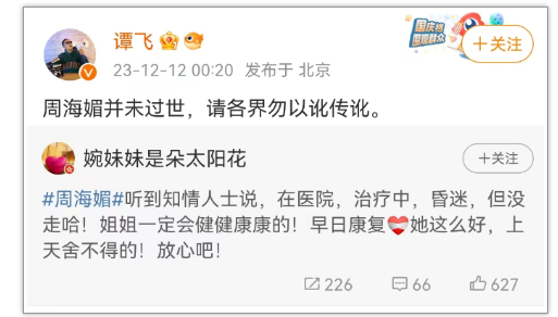 12月12日淩晨,身份認證為媒體記者的網友 @婉妹妹是朵太阳花在微博發文,“聽到知情人士說,在醫院,治療中,昏迷,但沒走哈!” 隨後,被譽為“影視界的知道分子”,曾參與策劃電視劇《康熙微服私訪記》的知名製作人、監制、影評人譚飛轉發這則微博後表示“周海媚並未過世,請各界勿以訛傳訛。”