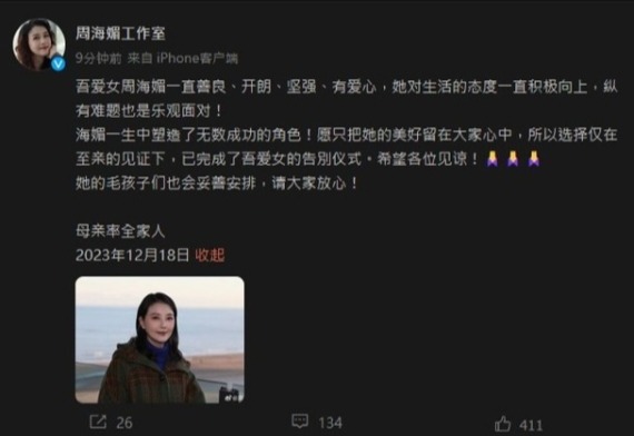 網友紛紛表示無法相信:“怎麽可能,周海媚的社交賬號還有動態更新!”“她才過完生日,怎麼可能突然離世……” 事件發生後,有媒體電話聯繫了周海媚工作人員,對方聽到來意就掛斷了電話,另一位工作人員聽到藝人名字後就以在應酬為由直接掛斷了電話。 在微博評論區,焦急的粉絲留言追問:“什麽情況啊?姐姐趕緊辟謠一下吧!” 據悉,周海媚剛於12月6日度過了自己57歲的生日。生日當天,周海媚工作室還轉發了她的短視頻,並寫道:“今天,57歲啦!感恩你們多年來的喜愛和陪伴,願大家健康、平安、喜樂”。