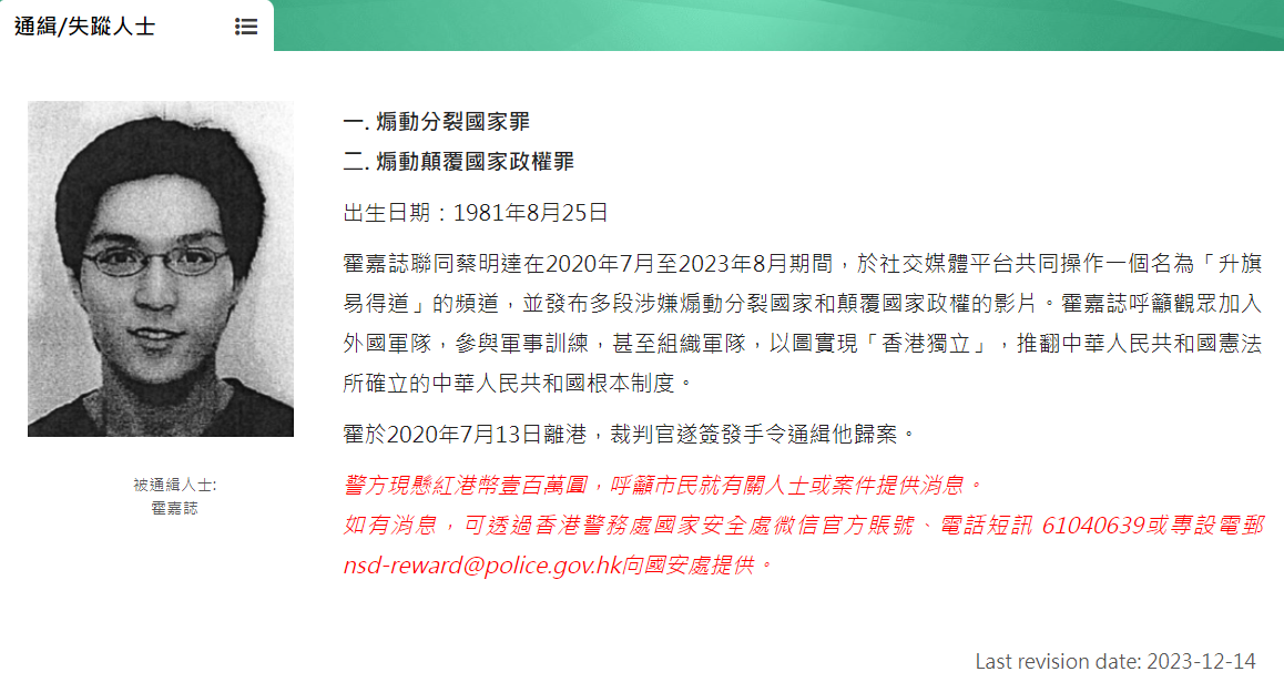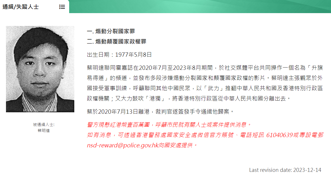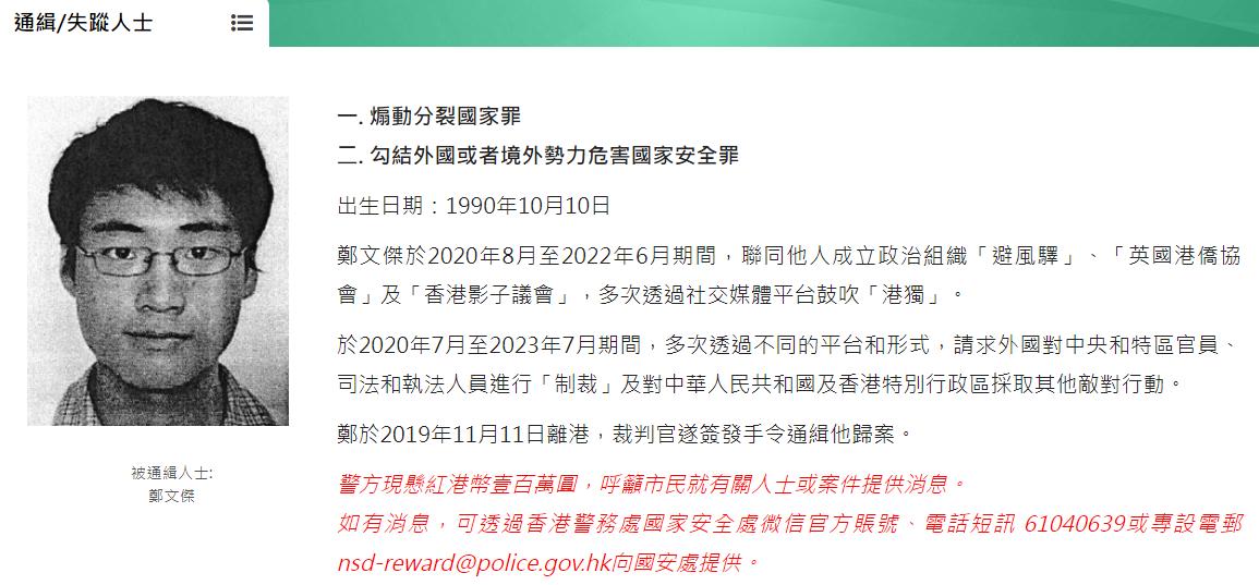 蔡明達 國安處總警司李桂華表示,鄭文傑涉煽動分裂國家、勾結外國及境外勢力危害國家安全罪。鄭文燦在2020年8月至2022年6月期間,聯同他人成立政治組織,並多次透過社交平台,多次鼓吹香港獨立。 據介紹,鄭文傑還與許穎婷及邵嵐,多次通過不同平台形式,請求外國對中國以及香港特區官員和司法人員制裁封鎖、採取敵對行為等。 至於霍嘉誌及蔡明達,涉嫌聯同他人開設社交頻道,多次發布影片呼籲加入外國軍隊或組織軍隊,並於外國接受軍事訓練,以武力對抗香港特區,在香港鼓吹“港獨”,呼籲外國制裁香港等。 李桂華補充道,霍嘉誌及蔡明達早前涉嫌訛稱幫助犯案的年輕人逃離香港,從而騙取合計十多萬港元,有關行為令人髮指。他們出賣國家,不顧香港人利益,行為卑劣,國安處會追究到底。 香港警方在今年7月已通緝8名逃犯,包括任建峰、袁弓夷、郭鳳儀、郭榮鏗、許智峯、羅冠聰,並各懸紅100萬港元。李桂華表示已收到超過500宗相關情報,部分相當參考價值。(完) 【編輯:陈卓仪】
