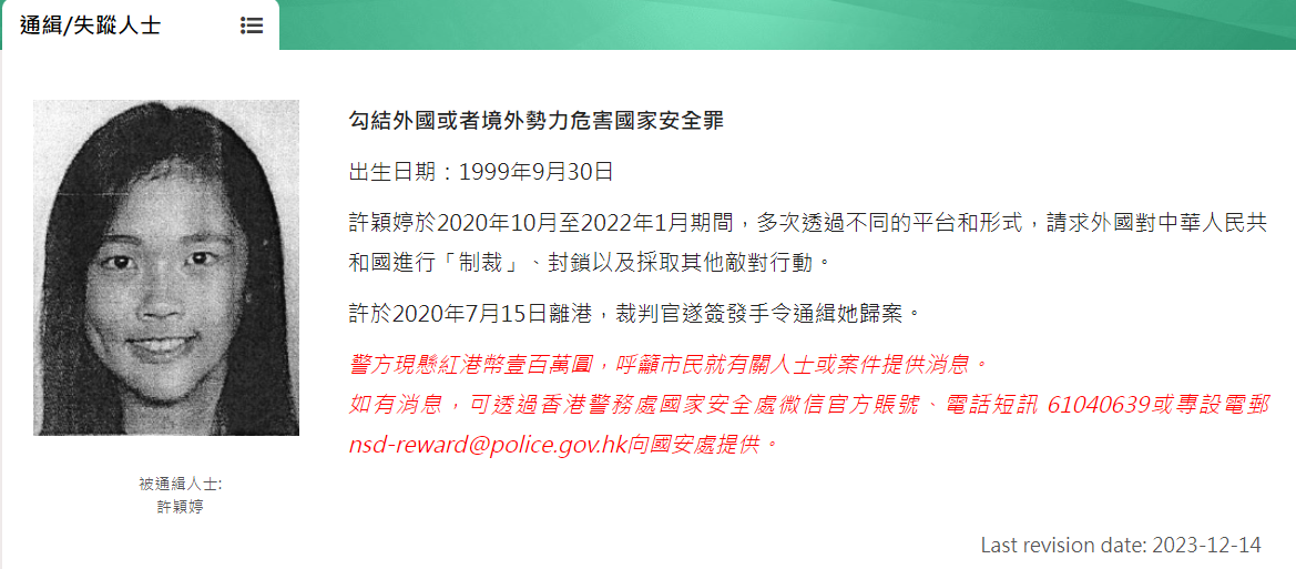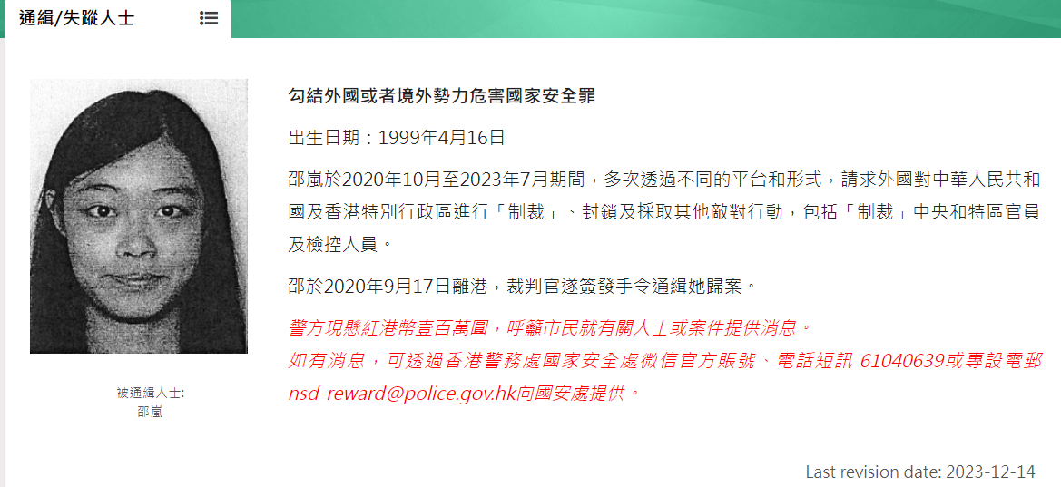 香港新聞網12月14日電(記者 陳偉根)香港警方國安處14日召開記者會,公布最新通緝令,各懸紅100萬港元通緝5名逃犯,他們分別是鄭文傑、許穎婷、邵嵐、蔡明達、霍嘉誌,涉嫌煽動分裂國家罪、煽動顛覆國家政權罪、勾結外國或境外勢力、危害國家安全罪等。