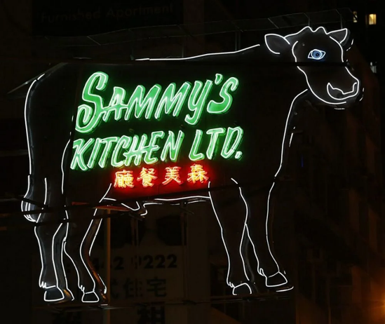 有些商鋪會特意根據經營範圍打造造型獨特的霓虹燈招牌。比如,“同昌押行”的霓虹燈招牌的整體形狀,是在中國文化中象征財富和繁榮的倒置的蝙蝠硬幣標誌;夜總會“中國宮殿”的霓虹燈以權杖形狀的手臂伸向彌敦道,上戴一個閃閃發光的皇冠,象征20世紀七八十年代夜總會的輝煌歲月;位於西營盤的一家歷史悠久的牛排餐廳“森美餐廳”,則因其大而俏皮的安格斯牛霓虹燈而聞名……