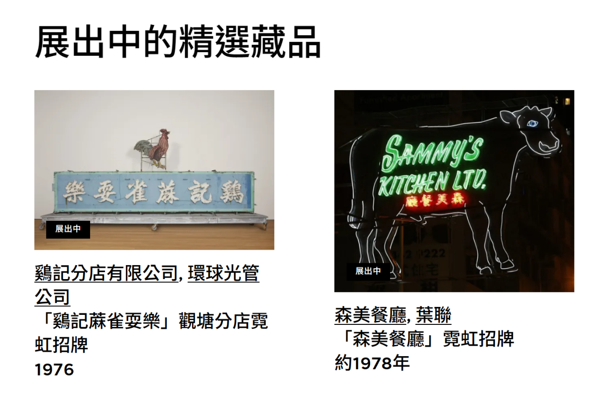 M+自2013年起收藏部分遭清拆的霓虹招牌,已將五塊納入館藏,其中“森美餐廳”和“鷄記蔴雀耍樂”是最先進入M+館藏的兩個招牌。此外,M+也收藏了大量霓虹招牌的檔案,包括設計繪圖和照片文獻。