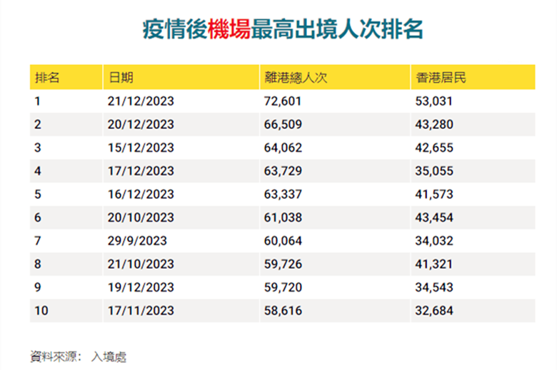 從上圖可以看出,今年前十個最高離港人次的日子,有6個在12月中下旬錄得,當中12月21日、20日、15日、17日及16日分別均名前5位,其離港人數均達到6萬人次以上,當中大部份為香港居民,可見市民外遊心切。(完) 【編輯:許豐悅】