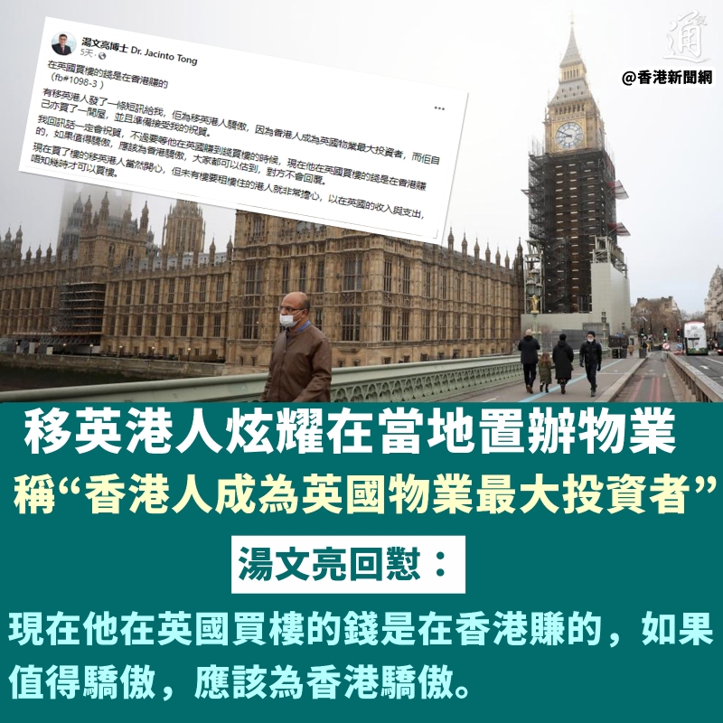 香港新聞網12月27日電 在英國買了房就值得驕傲了?一移英港人大肆宣揚自己在英國置辦了物業,還美其名曰“香港人成為英國物業最大投資者”,結果被懟得啞口無言…… 近日,香港紀惠集團副主席及行政總裁湯文亮在社交媒體臉書發文稱,有移英港人給他發了一條短訊,稱自己為移英港人驕傲,因為香港人成為了英國物業最大投資者,而他亦置辦了英國物業,希望湯文亮給予祝賀。 湯文亮回覆稱一定會祝賀,不過要等他在英國賺到錢買樓的時候,現在他在英國買樓的錢是在香港賺的,如果值得驕傲,應該為香港驕傲。湯文亮調侃道:“大家都可以猜到,對方收到這則訊息後就再也不回覆了。” 湯文亮說,現在買了樓的移英港人當然開心,但沒買樓還要在英國租樓住的港人就非常擔心,以目前在英國的收入與支出,不知何時才可以買樓。 不少網友紛紛表示認同,稱:“如果不是拿著在香港積累的財富,靠在英國的收入很難買房!” 這樣的擔憂不無道理。眾所周知,香港是全球稅率最低的地方之一, 薪俸稅最高也只是17%。而英國的入息稅稅率則是從 20% 起跳,根據個人收入,甚至可以高達 40% 甚至45%稅。所以即使稅前收入可觀,繳完稅到手的可支配收入就沒那麼理想了。