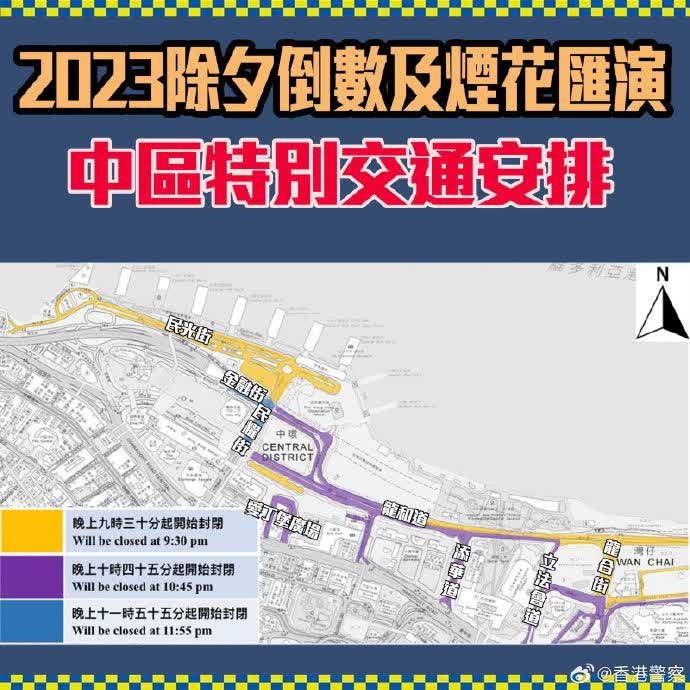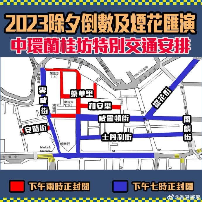 12月31日晚在維港舉行的煙花匯演,多個位置可供市民觀賞。圖自香港警方 港鐵本地鐵路綫以及輕鐵7條綫將通宵行駛,迪士尼綫及港鐵巴士第506、K51及K54號線將會延長服務時間。 22條巴士路線會加強或延長服務時間,九巴及城巴將在元旦凌晨提供特別巴士服務。 九龍及新界共有8條專條小巴路線延長服務時間;電車會延長服務至元旦凌晨1點,並因應乘客需求加強班次。香港運輸署呼籲市民盡量使用公共運輸服務。 警方將在傍晚6時起分階段封路,包括西九文化區及尖沙咀廣東道等一帶。至於港島區,中區、東區及山頂等同樣分階段封路。灣仔金紫荊廣場一帶今晚7時起封路;中環蘭桂坊就於下午2時起至明日凌晨5時會封閉。 另外,為配合煙花匯演,天星小輪、新渡輪、港九小輪、愉景灣航運及珀麗灣客運將於晚上10時半起,陸續調整及暫停部分航班。 香港海事處會於燃放煙花的躉船停泊範圍分兩階段設禁區,灣仔會展對開海面的禁區,將於今日(31日)中午12時半至元旦清晨約3時實施;尖沙咀文化中心對開海面的禁區,將在近元旦凌晨零時至約1時實施。 【編輯:許豐悅】