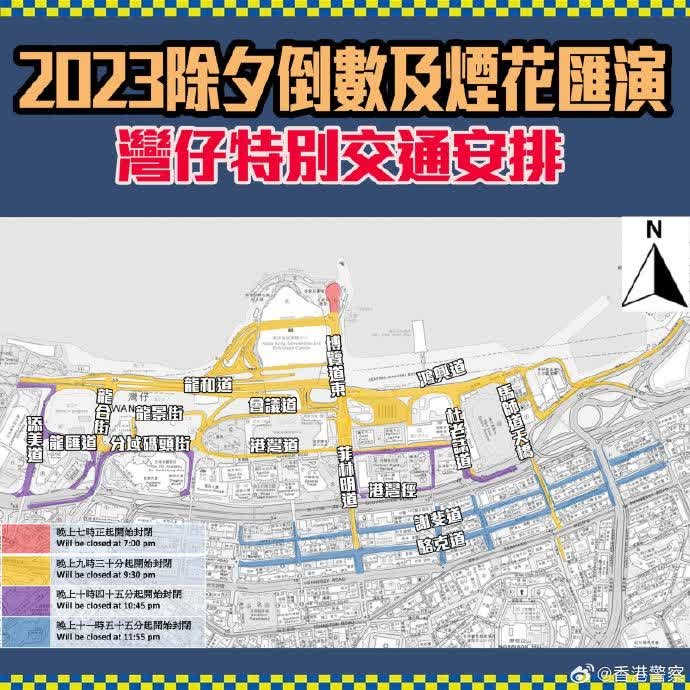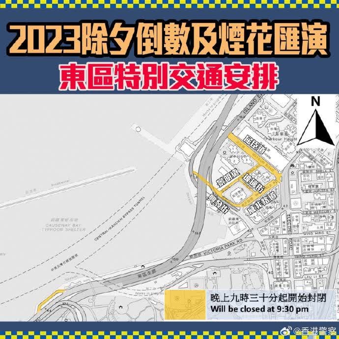 圖自香港警務處 除夕夜港九多處有封路改道,港鐵本地綫通宵行駛 為配合今晚(31日)在維港舉行的煙花匯演及相關節慶活動,相關部門將分階段實施特別交通及運輸安排,多項公共交通亦會加強服務。