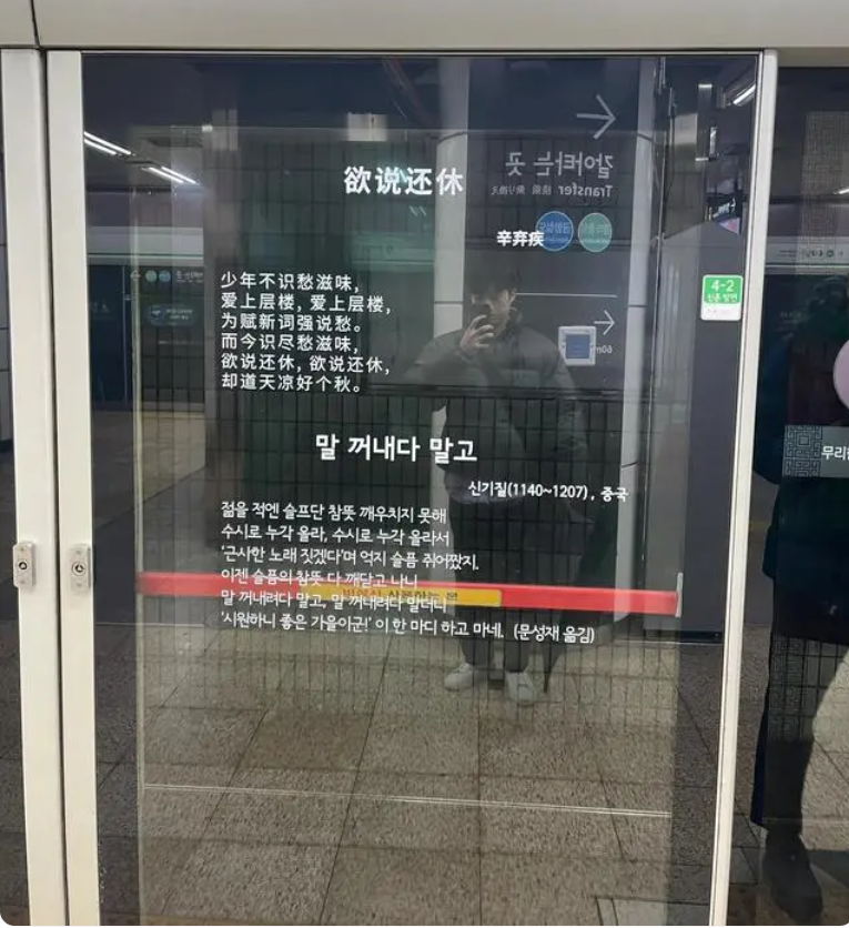 香港新聞網1月2日電 話題“韓國地鐵站竟然有宋詞”突然登上微博熱搜,網友拍攝的照片顯示,韓國地鐵候車處的門玻璃上有一首中韓雙語的辛棄疾《醜奴兒·書博山道中壁》這首詞。