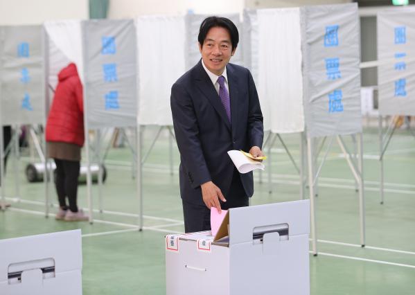 [9:58]民進黨賴清德1月13日一早就到台南安平中學投票所投票。香港中通社圖片