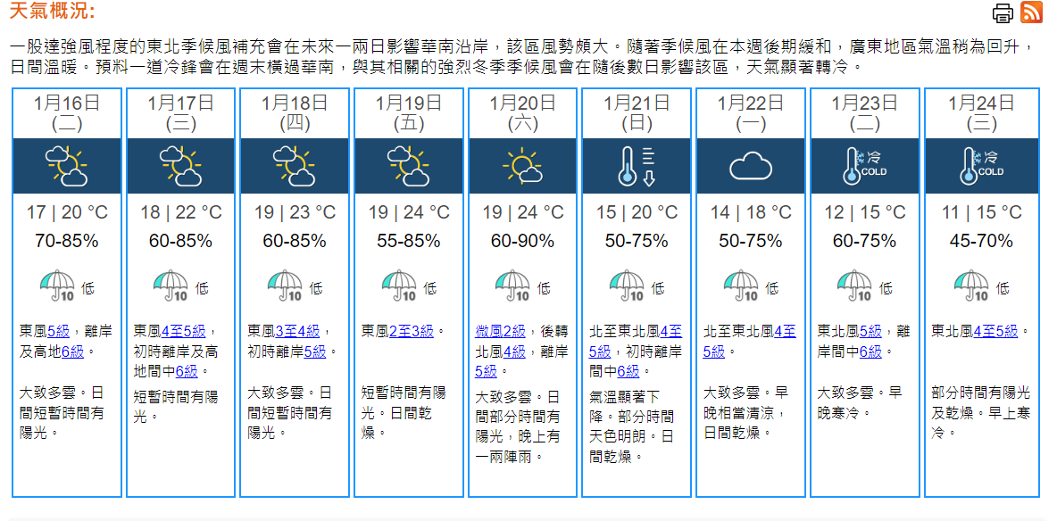 香港天文台預計本周日氣溫顯著下降