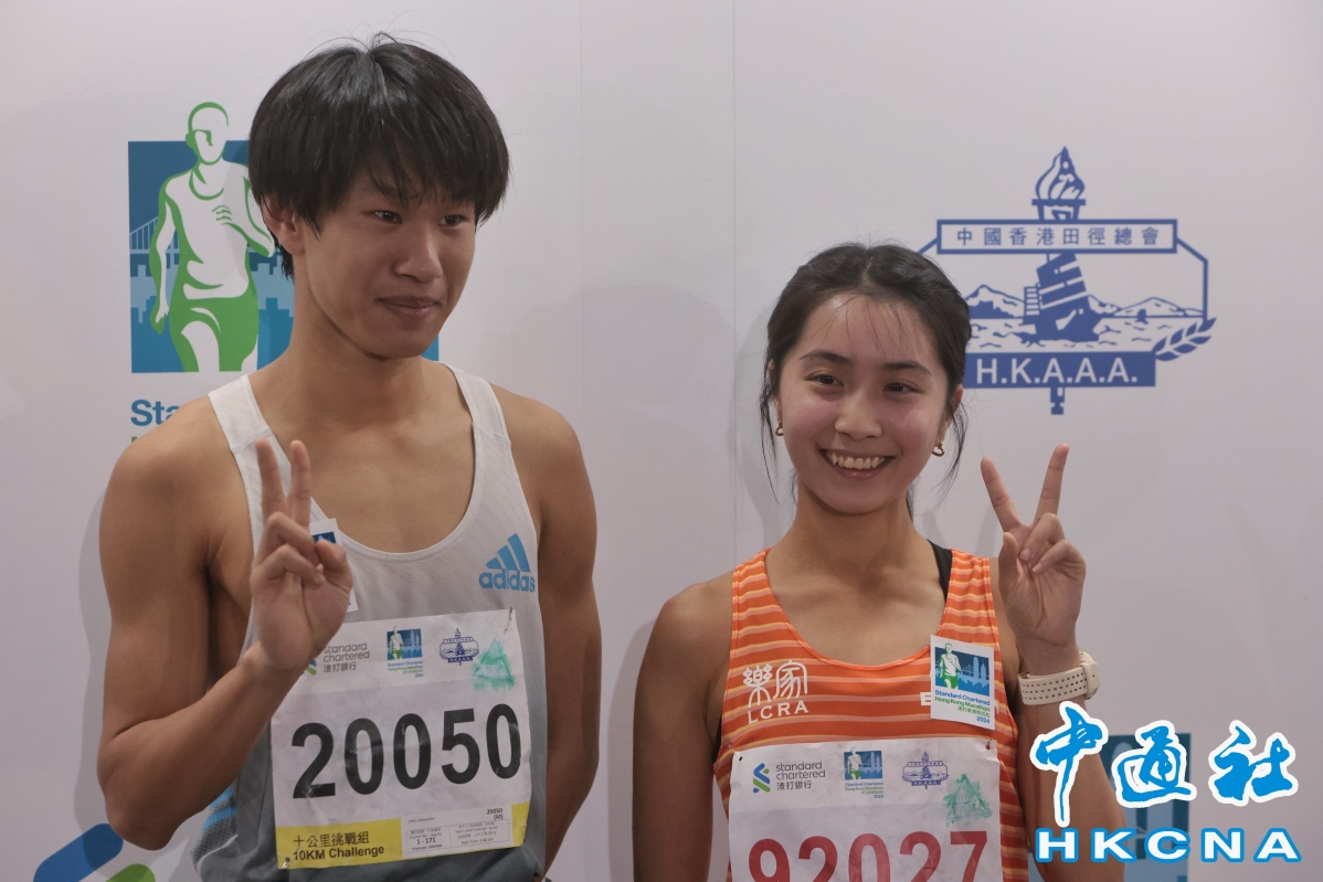 陳雨繁(左)、曾曉彤(右)。(香港中通社記者 謝光磊 攝) 來自北京的陳雨繁是首度來港參與渣馬。他表示,參賽因為想感受香港都市繁華,體驗渣馬氣氛。他又透露,日後有意進軍馬拉松,“希望能在26歲左右參加全馬比賽”。曾曉彤就指,前兩年參賽連挑戰組門檻也達不到,沒想到這次能夠奪冠,形容感覺很神奇。