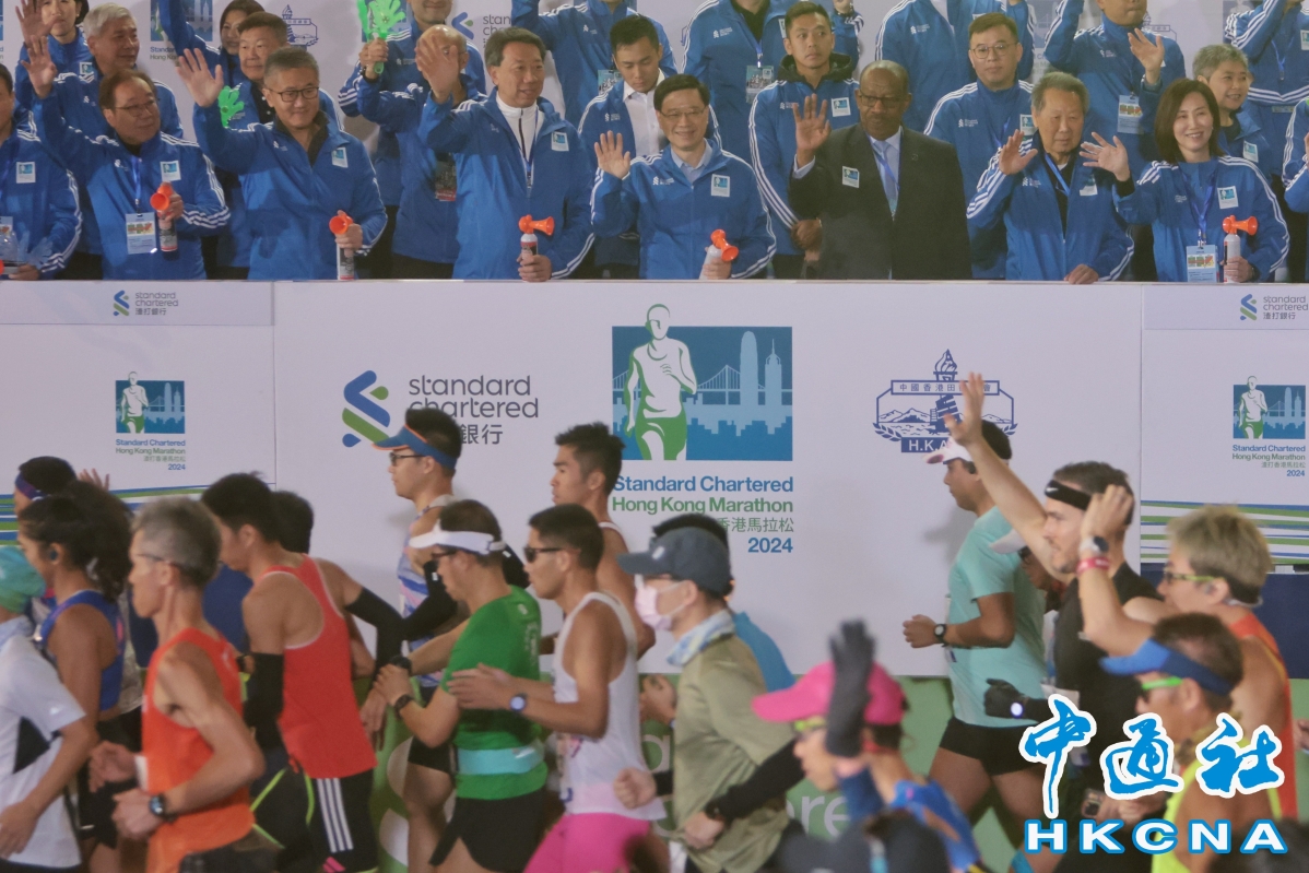 (香港中通社記者 謝光磊 攝) 香港特區行政長官李家超及警務處處長蕭澤頤等今早到尖沙咀主持起步禮,並於起步前與跑手握手交流。李家超隨後在社交平台發文表示,很高興看到2024年的香港盛事連連,不單為市民掀起一浪浪的歡樂氣氛,亦能吸引海外旅客來港,振興本港經濟。他強調特區政府會繼續推動、推廣在港舉行國際大型盛事,展現香港盛事之都的魅力,鞏固香港的國際城市地位。