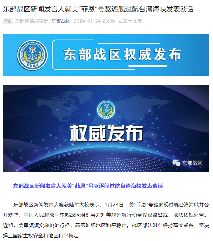 香港新聞網1月25日電 據東部戰區微信公眾號消息,東部戰區新聞發言人施毅陸軍大校表示,1月24日,美“菲恩”號驅逐艦過航台灣海峽並公開炒作。中國人民解放軍東部戰區組織兵力對美艦過航行動全程跟監警戒,依法依規處置。近期,美軍頻頻實施挑釁行徑,惡意破壞地區和平穩定。戰區部隊時刻保持高度戒備,堅決捍衛國家主權安全和地區和平穩定。(完)