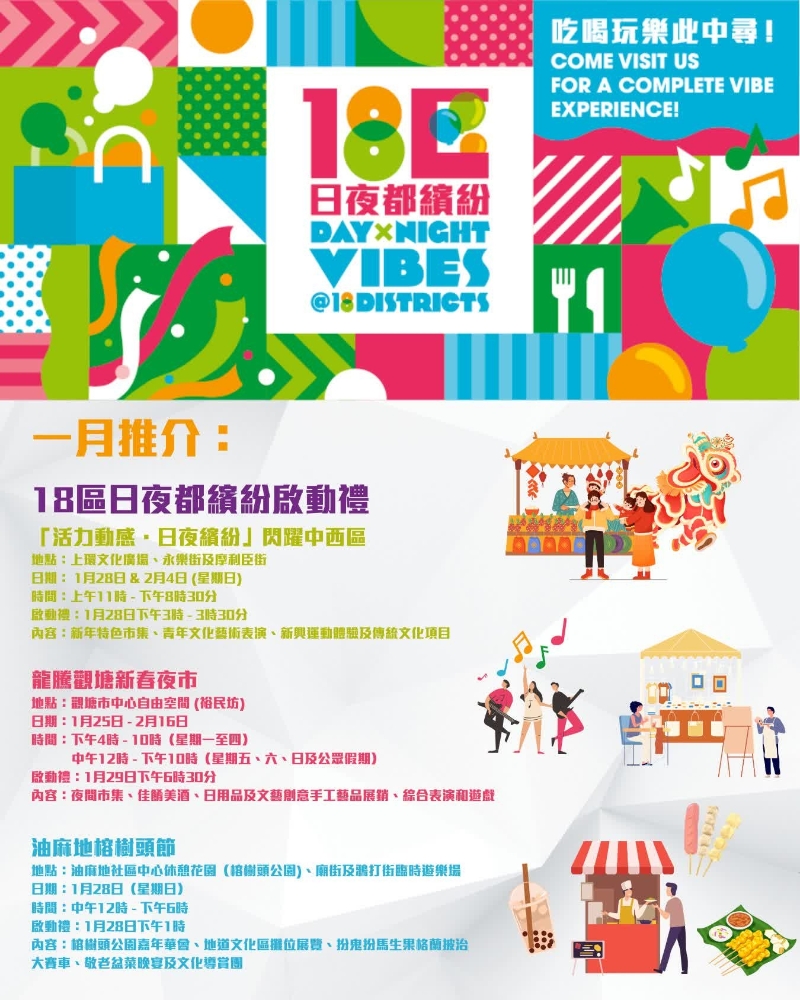 香港“日夜都繽紛”! 新春25個精彩活動一文看香港新聞網1月26日電 為提升節日氣氛及提振地區經濟,香港民政事務總署連同18區民政事務處及區議會,以“日夜都繽紛”為主題,即日(26日)起在全港各區舉辦連串活動,涵蓋新春夜市、綵燈會等。香港新聞網為讀者整理新春期間的25個活動詳情,讓大家可以在節日中玩得盡慶。 1月活動:龍騰觀塘新春夜巿 當中打響頭炮的活動就是“龍騰觀塘新春夜巿”於1月25日起至2月16日在觀塘市中心自由空間(裕民坊)舉行。夜間市集有80個攤位,包括熟食、零售、互動遊戲、舞台表演等,更大派福袋!活動時間為周一至周四下午4時至晚上10時;周五至周日及假日中午12時至晚上10時。