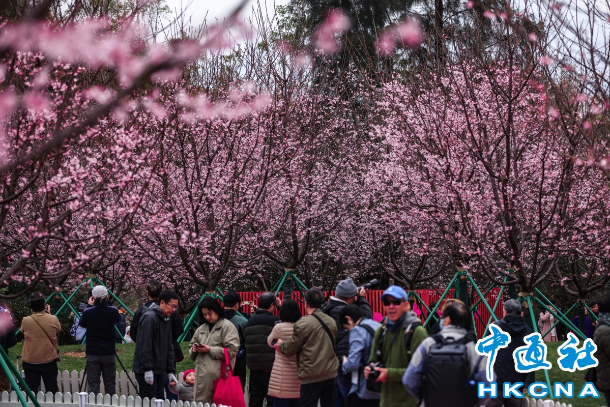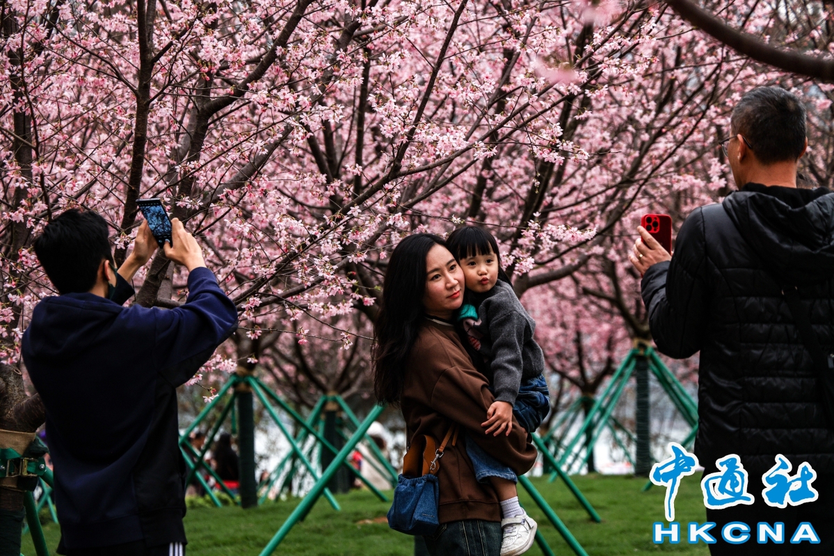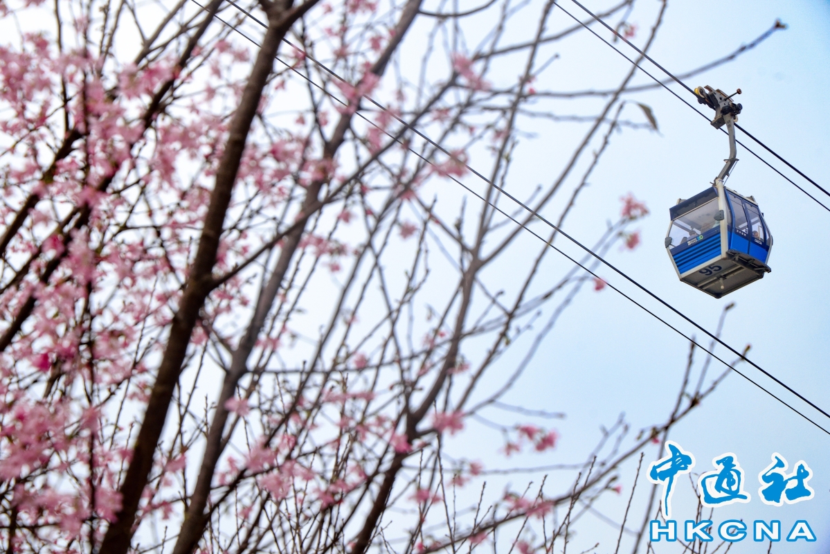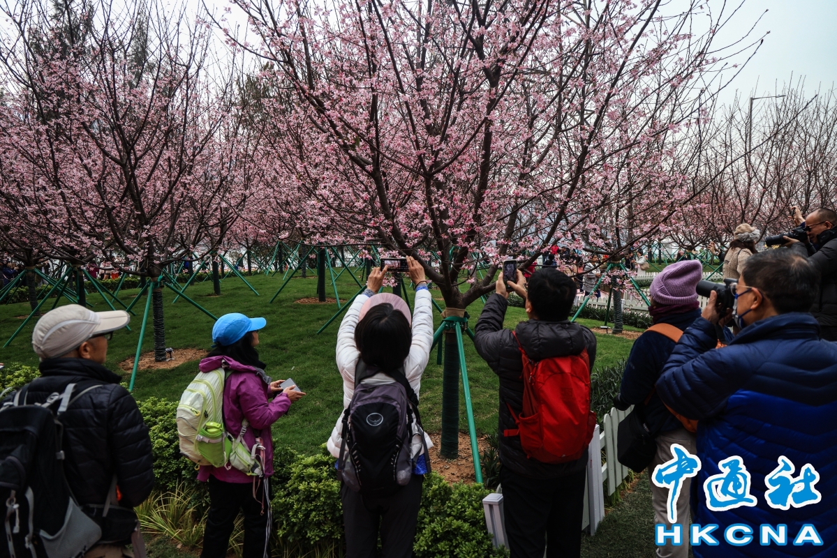 (香港中通社記者 許其皓攝) 機管局自2021年起推行機場島園景提升項目,種植全年不同時期開花的植物品種。去年起更在東涌赤鱲角南路觀景山山腳種植櫻花樹。今年更引入約85棵來自廣州的新品種“好運來”櫻花,配上園內的小橋、石凳等打卡位,映襯出櫻花樹的浪漫氛圍。 機場運行執行總監姚兆聰表示,“好運來”櫻花較往年種植的“廣州櫻”品種更耐熱,更適合香港的天氣;而櫻花顏色亦會更紅艷,花蕾更扎實。他續說,花期約7至14日,預計下周末是賞櫻的黃金時期,據過往經驗會有很多遊客到訪,屆時會按實際情況實施交通及人流管制眾。