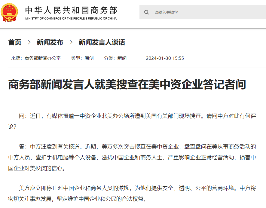 香港中通社1月30日電 有媒體報道一中資企業北美辦公場所遭到美國有關部門現場搜查。對此,中國商務部新聞發言人1月30日表示,美方應立即停止滋擾中國企業和商務人員,為他們提供安全的營商環境。 據中國商務部官網消息,新聞發言人表示,近期,美方多次突擊搜查在美中資企業,盤查盤問在美從事商務活動的中方人員,查扣手機電腦等個人設備,滋擾中國企業和商務人士,嚴重影響企業正常經營活動,損害中國企業對美投資的信心。