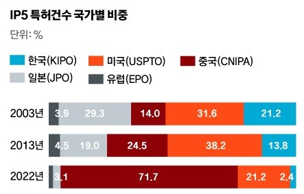 IP5專利件數在各國中所占比重。韓國《中央日報》截圖 注:韓國(藍)美國(橘)中國(褐)日本(灰)歐盟(深灰) 【編輯:胡雪石】
