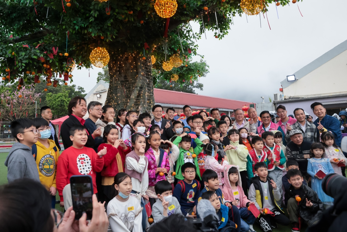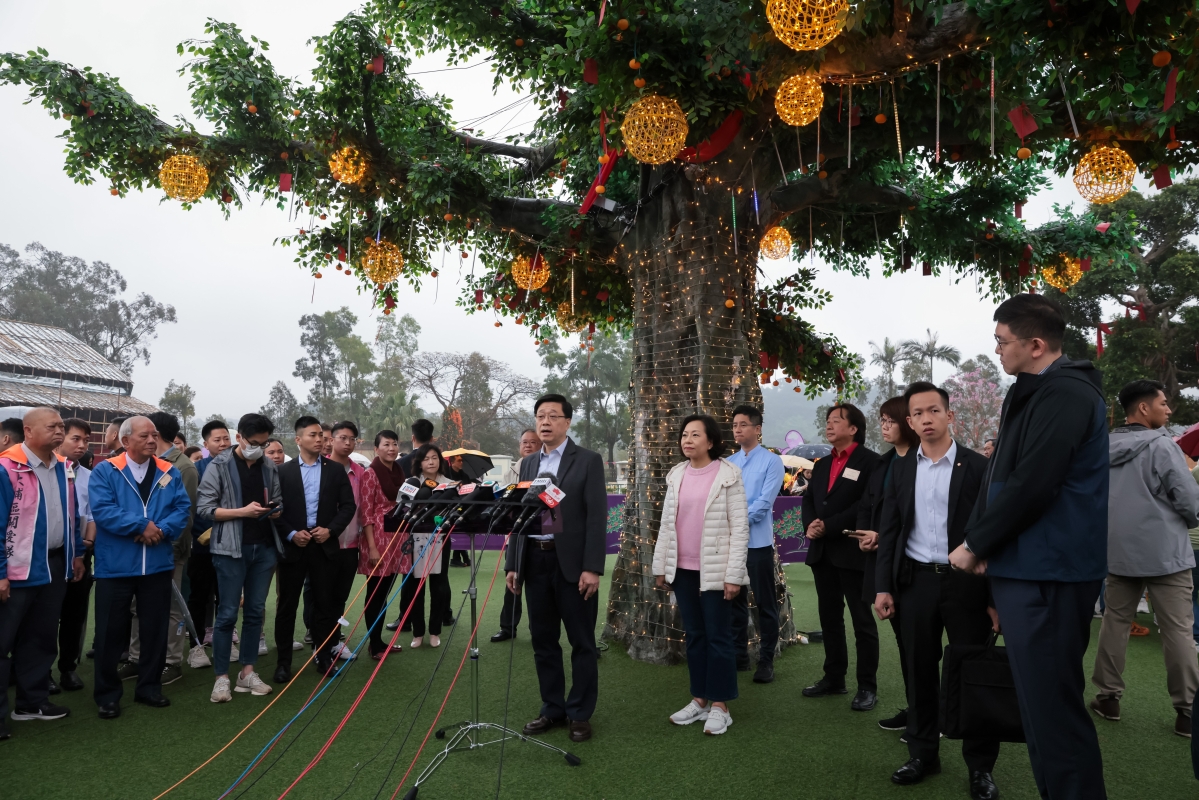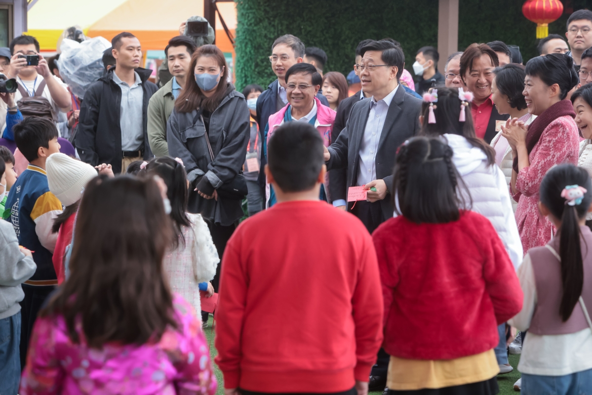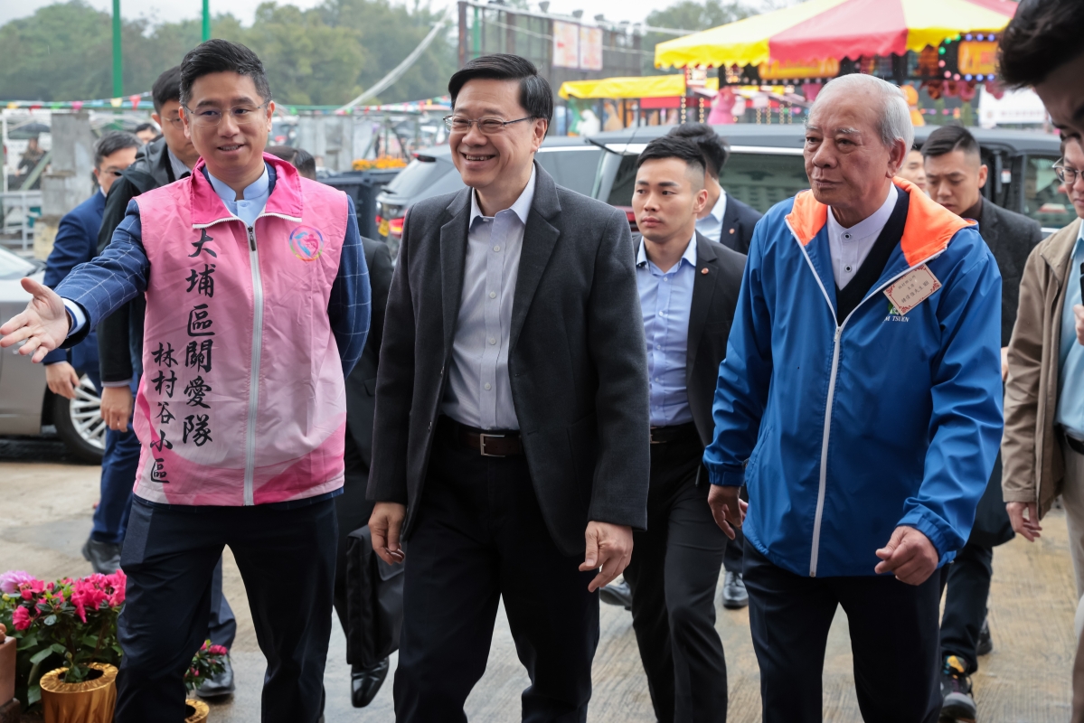行政長官李家超走進新界大埔林村,與長者吃盆菜、陪小孩拋寶牒