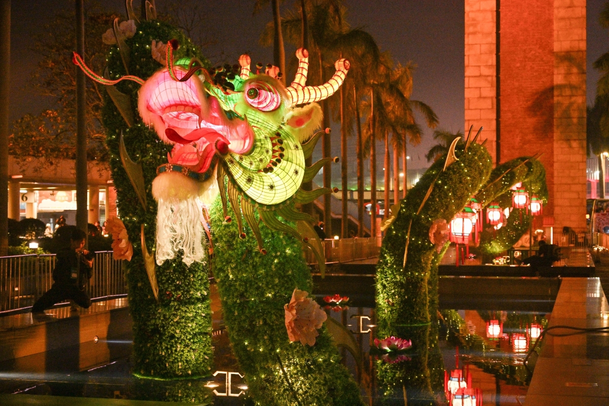新春綵燈展主題為“龍躍花燈・喜迎新歲”,於尖沙咀舉行。(香港中通社記者 黃璇攝) 元宵佳節賞花燈是必備的新年好去處,康文署元宵綵燈會2024分別在尖沙咀文化中心、香港單車館公園、天水圍公園及銀座廣場舉行。大家可以欣賞香港紮作師傅陳耀華製作的花燈作品及民族歌舞表演,參加燈謎競猜及工作坊,感受一年一度的香港綵燈會氣氛。 新春綵燈展主題為“龍躍花燈・喜迎新歲”,由即日至2月25日期間,每日下午6時至晚上11時展示花燈作品,由非物質文化遺產辦事處與紮作師傅陳耀華合製,作品以象徵春天生機的青龍為設計元素,舞龍在宮燈和年花之間穿梭,寄寓龍年欣欣向榮。元宵綵燈會則由2月20至25日期間舉行,綵燈會主題分別有尖沙咀綵燈會的“迎春接福・祥龍獻瑞”、天水圍公園及銀座廣場的“‘龍’情蜜意慶新歲”,以及香港單車館公園的“童趣夢幻樂園”。今年綵燈會將同場加映湖北省演藝集團的大型民族歌舞、舞麒麟演出及自助猜燈謎等活動。元宵綵燈會免費入場,讓大家一同歡度元宵。 新年商場佈置 利東街“福魚燈海.金龍獻歲”
