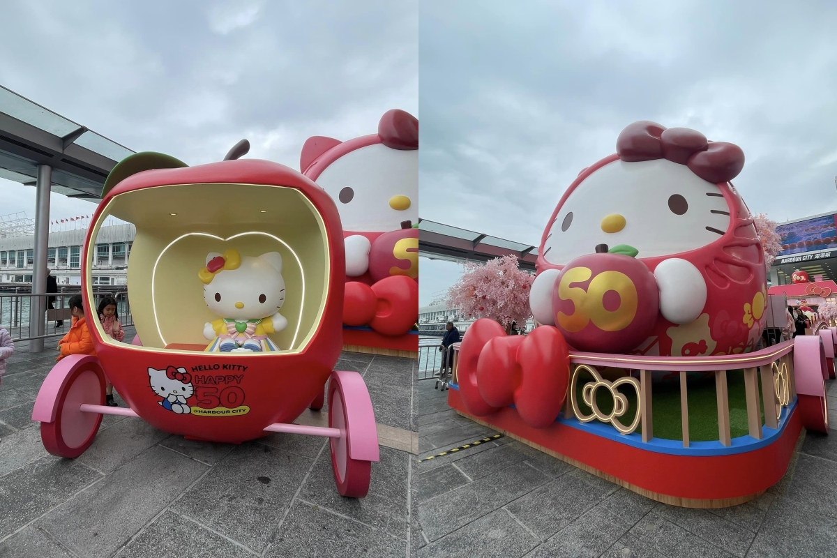 海港城“HELLO KITTY · HAPPY 50 @海港城”。(香港中通社記者 黃璇攝) Hello Kitty今年踏入50周年,正式擔任海港城的“國際親善大使”。海港城由即日起開展一連串的活動及會場限量精品,當中包括露天廣場的“花車巡遊”主題裝置,“海運觀點”觀景台的“旗鼓醒獅花園”裝置,花花宇宙藝術展覽及糖果曲奇期間限定店等。當中“花車巡遊”最為矚目,設有3個由不同角色駕駛的花車,當中主花車更有5米巨型Hello Kitty達摩,以圓碌碌的可愛造型,為大家送上不同的新年願望,各位粉絲不要錯過打卡機會! 銅鑼灣時代廣場“新春花蕾”