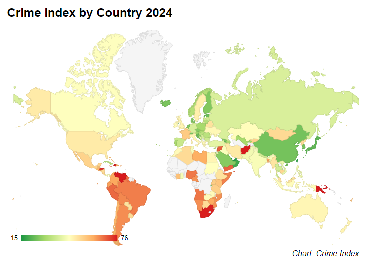 2024全球犯罪指數出爐:美國排名“平平無奇”卻被刷屏香港新聞網2月23日電 全球數據庫網站Numbeo日前公佈了2024年全球犯罪指數排名,在全球146個國家及地區當中,委內瑞拉以81.2分位列第一。讓人意外的是,美國儘管只排名58,看似“平平無奇”,卻被眾多海外網友點名,其中槍支泛濫問題更是成為網友吐槽的焦點。