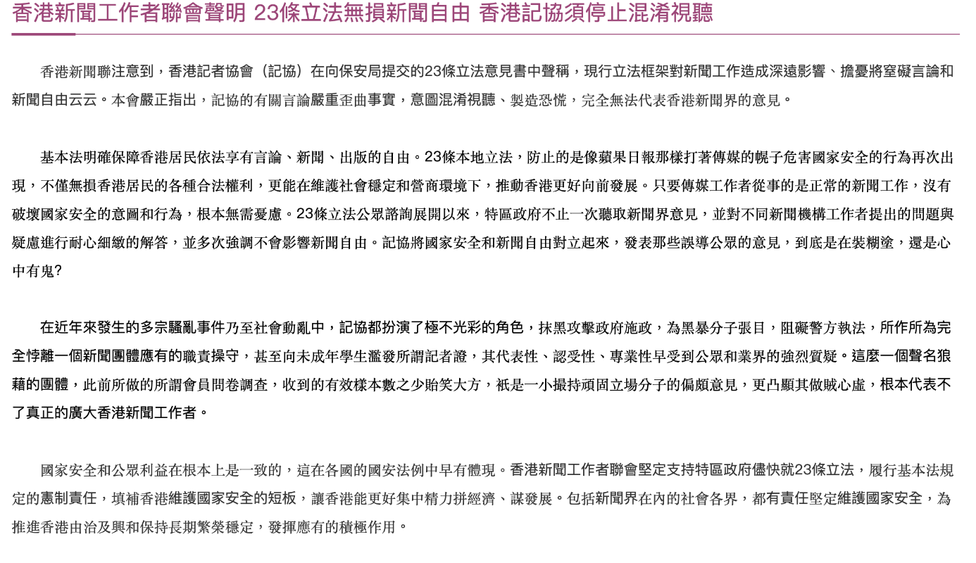 聲明指出,基本法明確保障香港居民依法享有言論、新聞、出版的自由。23條本地立法,防止的是像蘋果日報那樣打著傳媒的幌子危害國家安全的行為再次出現,不僅無損香港居民的各種合法權利,更能在維護社會穩定和營商環境下,推動香港更好向前發展。只要傳媒工作者從事的是正常的新聞工作,沒有破壞國家安全的意圖和行為,根本無需憂慮。23條立法公眾諮詢展開以來,特區政府不止一次聽取新聞界意見,並對不同新聞機構工作者提出的問題與疑慮進行耐心細緻的解答,並多次強調不會影響新聞自由。記協將國家安全和新聞自由對立起來,發表那些誤導公眾的意見,到底是在裝糊塗,還是心中有鬼? 在近年來發生的多宗騷亂事件乃至社會動亂中,記協都扮演了極不光彩的角色,抹黑攻擊政府施政,為黑暴分子張目,阻礙警方執法,所作所為完全悖離一個新聞團體應有的職責操守,甚至向未成年學生濫發所謂記者證,其代表性、認受性、專業性早受到公眾和業界的強烈質疑。這麼一個聲名狼藉的團體,此前所做的所謂會員問卷調查,收到的有效樣本數之少貽笑大方,衹是一小撮持頑固立場分子的偏頗意見,更凸顯其做賊心虛,根本代表不了真正的廣大香港新聞工作者。 國家安全和公眾利益在根本上是一致的,這在各國的國安法例中早有體現。香港新聞工作者聯會堅定支持特區政府儘快就23條立法,履行基本法規定的憲制責任,填補香港維護國家安全的短板,讓香港能更好集中精力拼經濟、謀發展。包括新聞界在內的社會各界,都有責任堅定維護國家安全,為推進香港由治及興和保持長期繁榮穩定,發揮應有的積極作用。(完) 【編輯:陈卓仪】