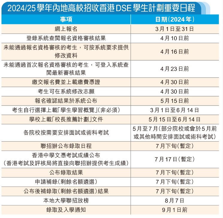 圖源:大公文匯 申請人必須在報名期內完成報名確認程序才可進入錄取階段。另外,申請人可於3月1日至6月14日期間登入報名系統以上載“學生學習概覽”,而學校亦可在5月15日至6月14日期間上載“校長推薦計劃”的相關資料。 根據2024/25學年的招生程序,各院校可根據考生報考資料安排面試/術科考試,申請人需留意院校的安排及通知。院校將於文憑試成績發放後公佈錄取名單,並根據招生情況進行網上補錄(即剩餘名額遴選)。有關錄取安排及入學通知的詳情,將於稍後公佈。 教育局聯同交流中心和學友社合作編印《內地高校招收香港中學文憑考試學生計劃指南》(只有中文),提供有關文憑試收生計劃及內地升學的全面資訊,包括載列所有參加計劃的內地院校資料、學科選擇、選科策略,以及畢業生分享等。指南已於去年12月初舉辦的2024/25學年內地高等教育展免費派發,並郵寄至全港中學,電子版及其他詳情亦已上載至教育局網頁。 此外,於指定內地院校修讀學士學位課程的合資格香港學生,可申請內地大學升學資助計劃下的經入息審查資助或免入息審查資助。2024/25學年資助計劃的申請詳情,將於今年年中公佈。 (完) 【編輯:錢林霞】