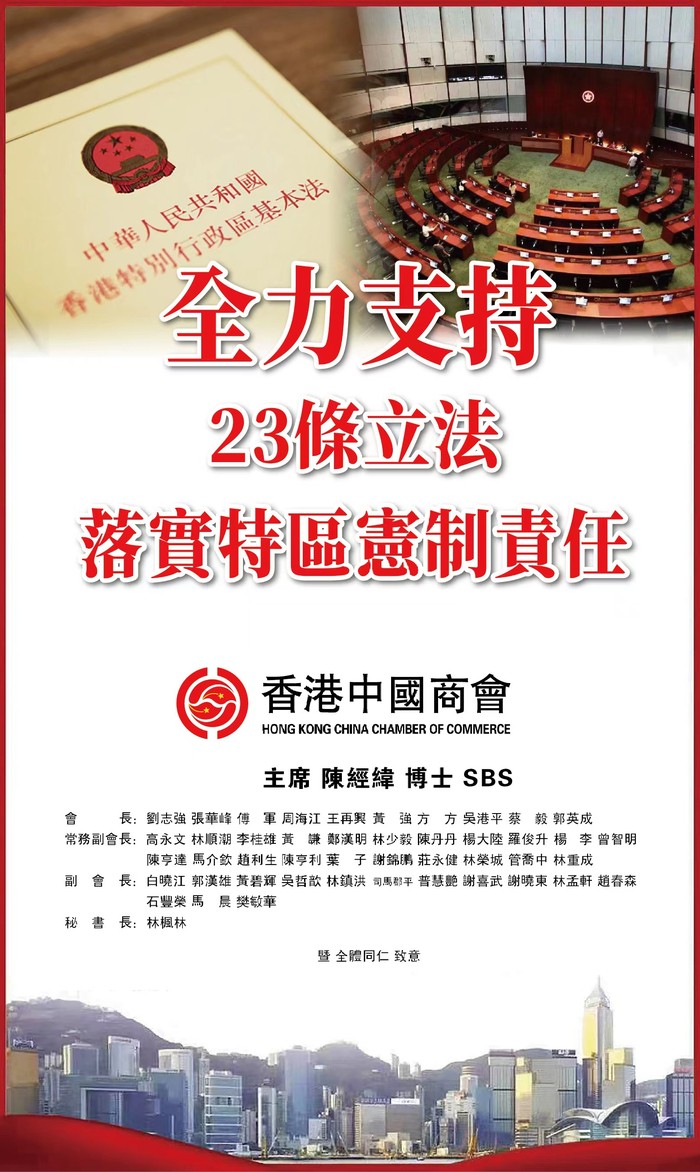 香港中國商會是由香港企業、中國內地企業、海外華資企業、海內外華人企業家和專業人士聯合成立的非牟利商會組織。本會於本月初發函呼籲會員,認真閲讀23條立法公衆諮詢文件內容,領會其精神,幷提出具建設性的建議和意見。衆多會員踴躍建言獻策,認為立法愈早完成愈好。 穩定是發展的前提,沒有穩定,一切都無從談起。香港是國際金融中心,擁有大量外資企業。外商是香港市場的重要持份者和建設力量,保持穩定運行的營商環境,保障可預期的發展前景,需要有23條立法來保駕護航。 經濟安全是國家安全的重要一部分,只有確保國家安全,才能為經濟發展提供牢固的屏障。完成23條立法,有助於減少政治風險和不確定性,外商投資者將受益於一個更安全和穩定的投資環境;有助於明確外商投資的法律環境和監管框架,確保投資者在相應法律規範下從事商業活動;有助於建立一個透明、公平和可預測的投資環境,為投資者提供更好的法律保護和發展前景。 我們認爲,爲了更好落實23條立法,要做好兩件事: 一,加強宣傳解說。充分發揮香港在“一國兩制”之下背靠祖國 聯通世界的優勢,幫助國際社會更好了解23條立法的必要性和合理性。由政府部門牽頭,由重要商會代表、商界知名人士組成代表團,前往同香港關係密切的海外大城市,舉行23條立法說明會研討會,消除不必要的誤解和顧慮。 二,加强對青年學生的教育。青年是香港未來的主人翁,前段時間,由於國民教育方面出現缺失,一些青年國家安全觀念薄弱,衍生過不少問題。現時要趁23條立法之機,培養青少年法治素養。23條立法不僅是一項立法工作,更是一個持續的教育過程,需要社會各界包括學校、家庭、媒體等的共同參與和支持,加強青少年對法律制度的認識和信心,培養青少年對國家的認同和責任感,建立大局觀、國家觀,將個人理想抱負與國家發展和民族復興聯繫起來,不負韶華,共同為維護國家安全和香港穩定貢獻力量。(完) 【編輯:譚暢】