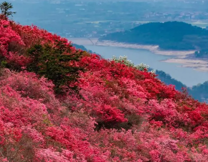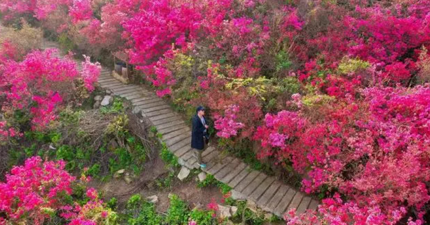 晚上的東湖櫻花園。 武漢市園林植物園:該園是武漢最古老的公園之一,有著濃鬱的古典園林風格和悠久的歷史,同時也是武漢觀賞櫻花的熱門去處,園內的櫻花種類繁多,景色非常美麗。 當然,除了櫻花,還可以觀賞其他—— 黃陂雲霧山——滿山杜鵑花開 都知武漢櫻花美,不識黃陂杜鵑紅。位於武漢黃陂區的雲霧山四月最美的萬畝杜鵑花才剛剛開始,紅的似火,艶若雲霞。雲霧山位於武漢市黃陂區李家集街道泡桐店境內,自古以來就有“西陵勝地,漢地祖山”的美譽。春天的時候只見漫山遍野的杜鵑花如期綻放,在坳間,在山崖上,綠色和紅花相得益彰,一叢叢的綠,綠得青翠欲滴;一簇簇的紅,紅得像一片片火焰。滿山滿穀都是搖曳的彩色,風吹花浪滾滾,如雲似霞,大山以燦爛的姿態迎接春天的到來。