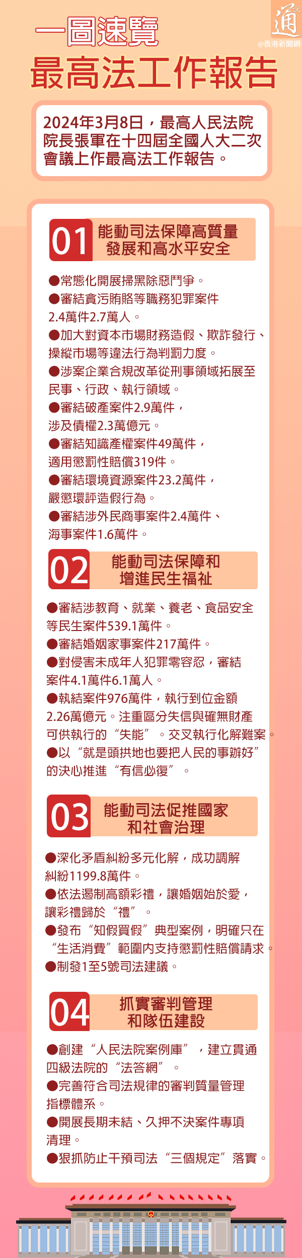 香港新聞網3月8日電  2024年3月8日,最高人民法院院長張軍在十四屆全國人大二次會議上作最高法工作報告。極簡版來了!戳圖了解!