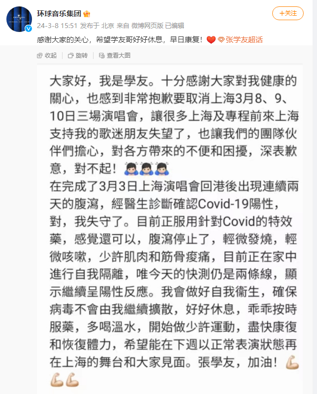 香港新聞網3月8日電 3月8日下午,中國香港男歌手張學友通過@環球音樂集團 回應上海站演唱會取消,稱自己確診新冠陽性,正在家中自我隔離,希望盡快恢復體力,下周以正常表演狀態在上海的舞台和大家見面。 全文如下: 大家好,我是學友。十分感謝大家對我健康的關心,也感到非常抱歉要取消上海3月8、9、10日三場演唱會,讓很多上海及專程前來上海支持我的歌迷朋友失望了,也讓我們的團隊夥伴們擔心,對各方帶來的不便和困擾,深表歉意,十分對不起! 在完成了3月3日上海演唱會回港後出現連續兩天的腹瀉,經醫生診斷確診Covid-19陽性,對,我失守了。目前正服用針對Covid的特效藥,感覺還可以,腹瀉停止了,輕微發燒,輕微咳嗽,少許肌肉和筋骨痠痛,目前正在家中進行自我隔離,唯今天的快測仍是兩條線,顯示繼續呈陽性反應。我會做好自我衛生,確保病毒不會由我繼續擴散,好好休息,乖乖按時服藥,多喝温水,開始做少許運動,盡快康復和恢復體力,希望能在下週以正常表演狀態再在上海的舞台和大家見面。張學友,加油!
