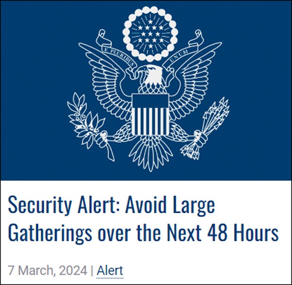 美國駐俄羅斯大使館官網截圖 據路透社3月8日報道稱,在美國駐俄羅斯大使館發出警告前幾小時,俄羅斯安全部門表示,他們挫敗了“伊斯蘭國”阿富汗分支的一個小組在猶太教堂發動槍擊的計劃。“今日俄羅斯”(RT)則指出,這一警告是在莫斯科與華盛頓關係持續緊張之際發出的。 截至目前,俄羅斯當局尚未對此置評。 3月7日,美使館在其官網上發表聲明,稱監測到有關極端分子計劃針對莫斯科大型集會(包括音樂會)發動襲擊的消息,并建議美國公民在未來48小時內避免參加大型集會。 聲明提醒美國公民盡量避免去人多的地方,多關注當地媒體的最新消息,以及時刻對周圍環境保持警惕,但并未提供更多的細節。 路透社稱,早前,俄羅斯安全部門稱其發現并阻止了正準備用槍支襲擊猶太教堂的武裝分子,并繳獲了槍支、彈藥以及製造簡易爆炸裝置的部件。不過,暫不清楚美方警告是否與這起事件有關。