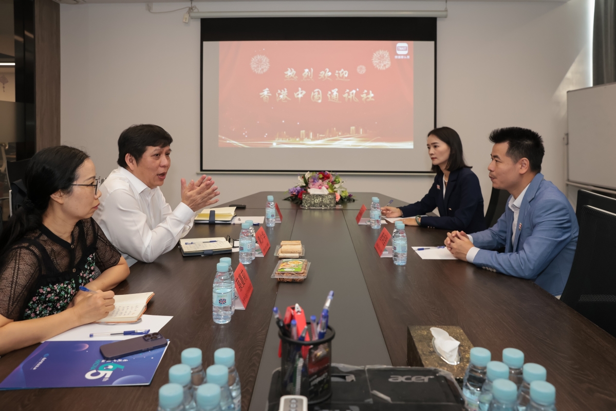 圖為香港中通社代表團拜訪華商日報和柬中時報,並與該報總編輯阮志強(中)、副總編輯黃如麗(左三)等交流。