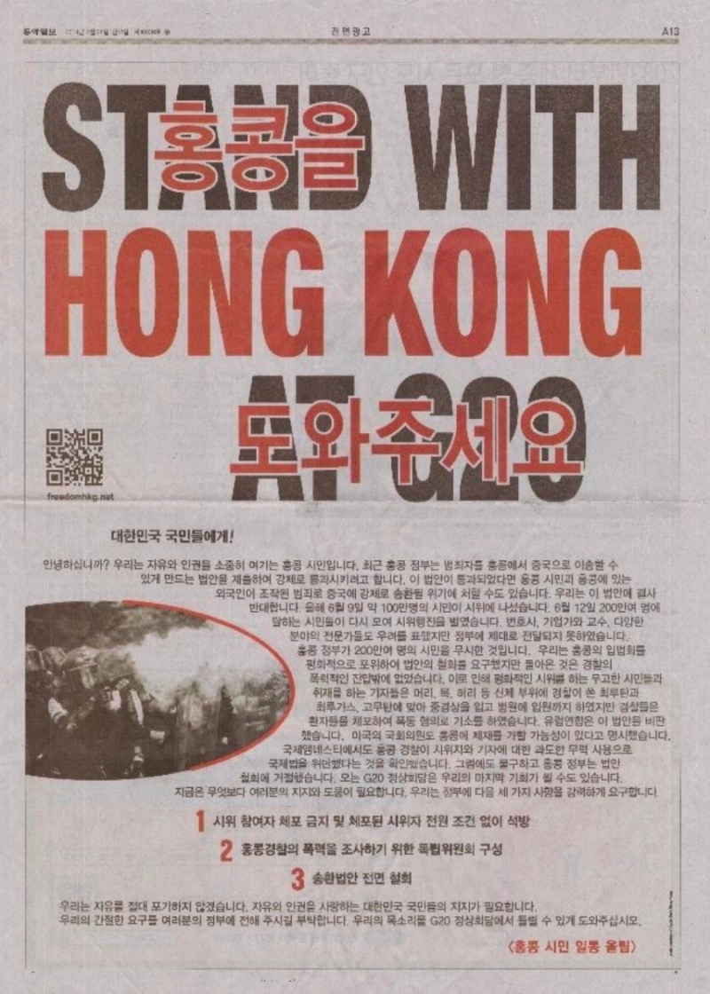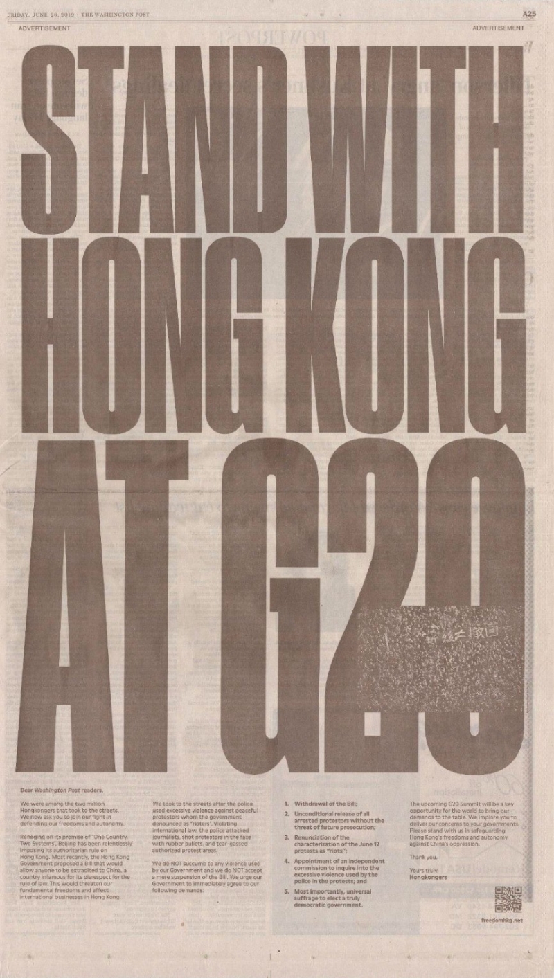 庭審李宇軒的首日,他就透露,2019年6月香港出現激烈的示威畫面,當時他身處的telegram群組,成員都希望將這些“搶眼”畫面帶到國際舞台。他們瞄準在日本G20峰會期間,盡量找多份國際報紙登廣告,并決定以眾籌取得資金 ,稱之為“G20全球登報計劃”。 他們首先在討論區“連登”宣傳,扣除平台費用後,籌得620萬港元,但李宇軒的收款帳戶被凍結,需要有人墊支廣告費。 他說:“我用曬自己3球(即300萬港元)的積蓄,但都不够墊支廣告費,所以有錢銀問題。”在群組透露情況後,同為被告的律師助理陳梓華以“T”身份私下向他聯絡稱可墊付約500萬港元。 控方在法庭上展示G20登報單據,他們於2019年6月27日在《衛報》、《南德意志報》、《歐洲政治報》登報,於2019年6月28日在《華盛頓郵報》、《紐約時報》(美國版及國際版)、《朝日新聞》、《日本時報》、《澳洲人報》、《東亞日報》、《韓國日報》、法國《世界報》等登報,另於2019年6月29日在《泰晤士報》、西班牙《世界報》及《歐洲政治報》等多份報章登報。