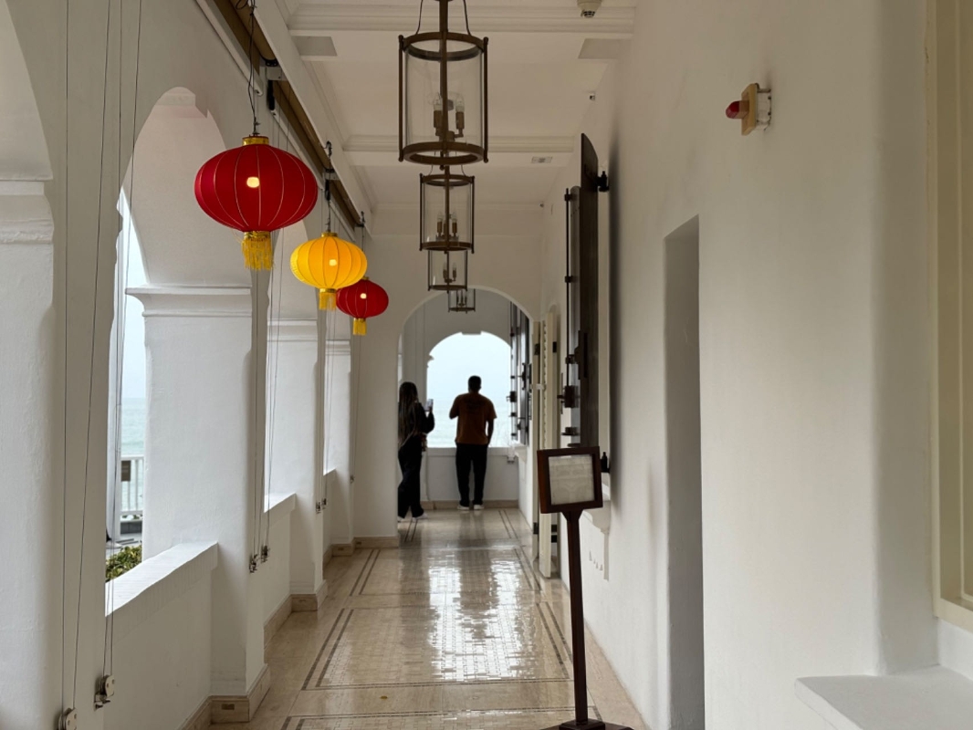 酒店套房向海一方,門外設有長廊。(香港中通社記者 黃璇攝) 酒店套房向海一方,門外設有長長的走廊,門窗都安裝了木製百葉片,房內保存了英國傳統的壁爐,滲透着昔日殖民地的設計色彩。