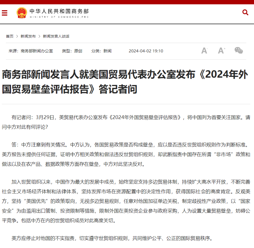 中國商務部網站截圖 有記者問:3月29日,美貿易代表辦公室發佈《2024年外國貿易壁壘評估報告》,將中國列為首要關注國家。請問中方對此有何評論? 中國商務部新聞發言人表示,中方注意到有關情況。中方認為,各國貿易政策是否構成壁壘,應以是否違反世貿組織規則作為判斷標準。美方報告未提供任何證據,證明中方相關政策和做法違反世貿組織規則,卻武斷指責中國存在所謂“非市場”政策和做法以及在農產品、數據政策等方面存在壁壘,中方對此堅決反對。 加入世貿組織以來,中國作為最大的發展中成員,始終堅定支持多邊貿易體制,持續擴大高水平開放,不斷完善社會主義市場經濟體制和法律體系,堅持發揮市場在資源配置中的決定性作用,獲得國際社會的高度肯定。反觀美方,堅持“美國優先”的政策取向,無視多邊貿易規則,任意對他國加征單邊關稅,制定歧視性產業政策,以“國家安全”為由濫用出口管制、投資限制等措施,限制外國在美投資企業參與政府採購,人為設置大量貿易壁壘,妨礙公平競爭。包括中方在內的世貿組織成員對此高度關切。 美方應停止對他國的不實指責,切實遵守世貿組織規則,共同維護公平、公正的國際貿易秩序。(完) 【編輯:丘志彬】
