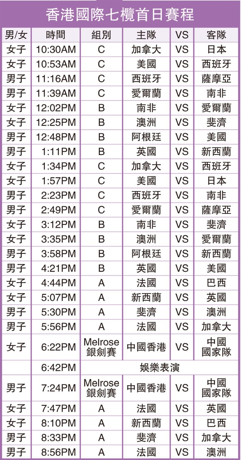 香港“七欖”今日揭幕 港男女隊迎戰國家隊爭殊榮香港新聞網4月5日電 “國泰/滙豐香港國際七人欖球賽”今日(4月4日)起一連三日在香港大球場舉行,這是賽事在即將改建的大球場最後一次表演,下屆起將移至啟德體育園舉行。香港男女子隊將參加首辦的亞洲三角賽“Melrose銀劍賽”,力爭冠軍殊榮。 香港站除了男女子隊12支世界強隊在世界七欖系列賽激鬥外,同場還會上演新設的亞洲三角賽─“Melrose銀劍賽”。今次首度舉行的“銀劍賽”,包括男子組的中國香港隊、中國國家隊和日本隊,以及女子組的中國香港隊、中國國家隊和泰國隊。他們以單循環形式定出決賽球隊,積分最高兩隊將出戰周日上演的決賽。