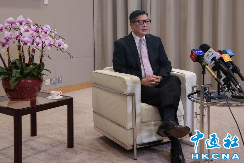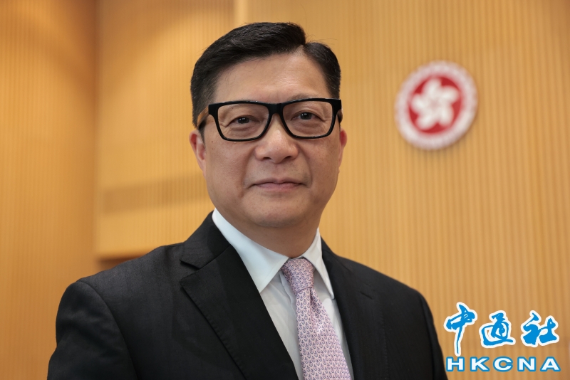 (香港中通社記者 謝光磊 攝) 香港中通社圖片 作為維護國安條例立法工作的主要推動者,鄧炳強指出,立法後初期,與律政司司長做了很多推廣及解說工作,包括到電台、電視台、商會講解。接下來,會將條例講解工作拼接進整體國家安全的推廣工作中。