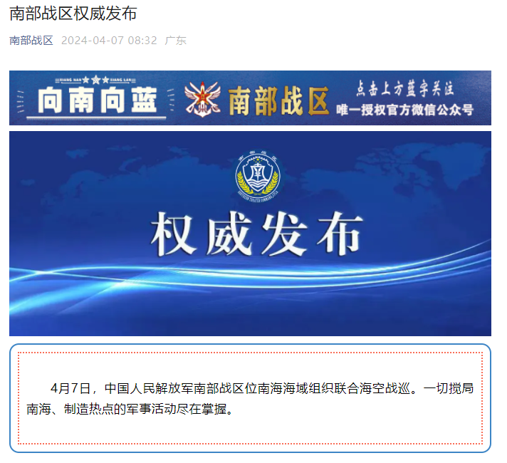 香港新聞網4月7日電 據南部戰區微信公眾號消息,4月7日,中國人民解放軍南部戰區位南海海域組織聯合海空戰巡。一切攪局南海、製造熱點的軍事活動盡在掌握。