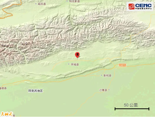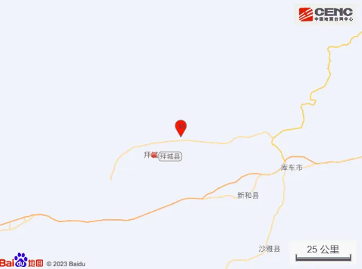 周邊縣城:震中距拜城縣24公里、距新和縣62公里、距庫車市81公里、距沙雅縣99公里、距特克斯縣145公里,距阿拉爾市168公里,距烏魯木齊市499公里。