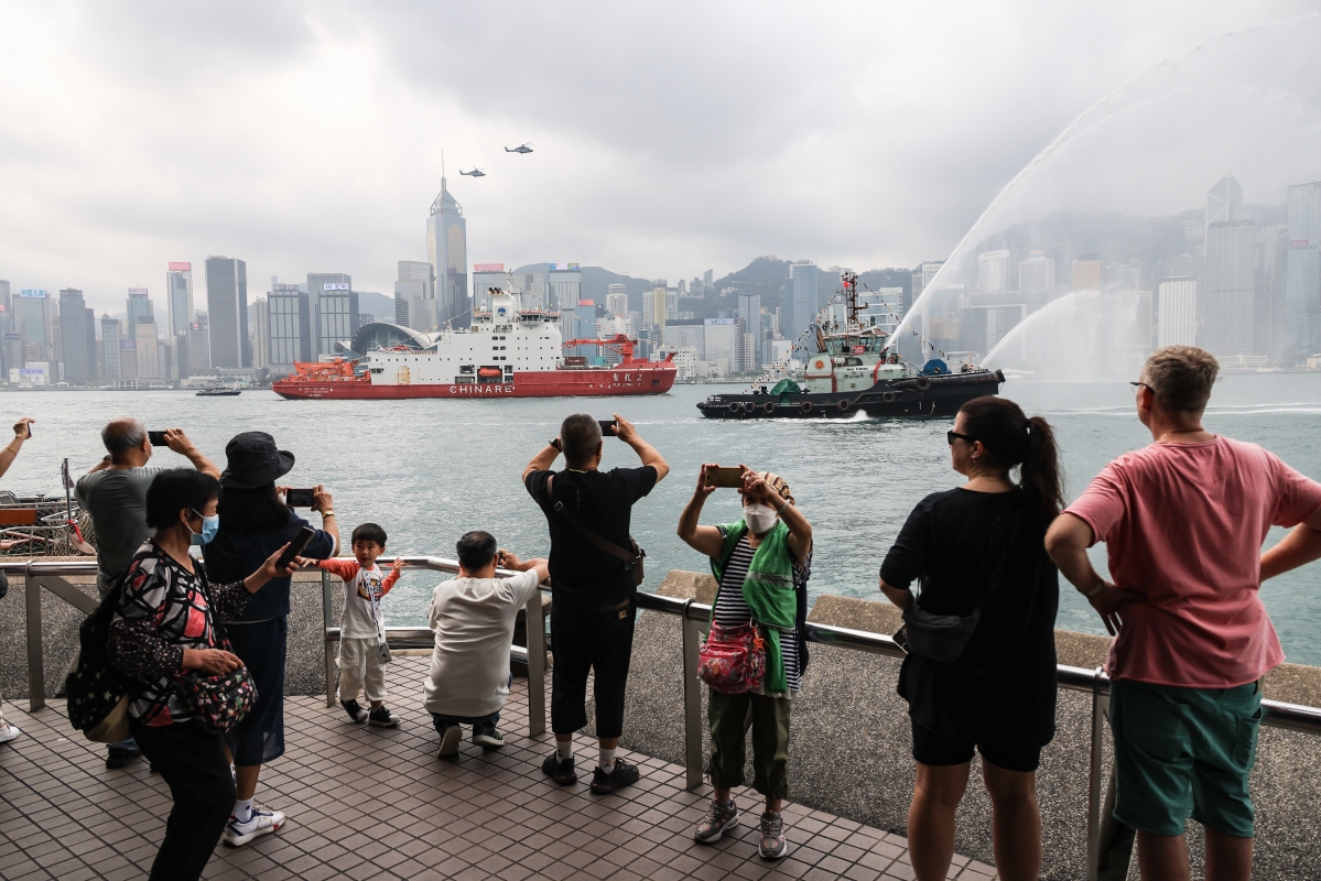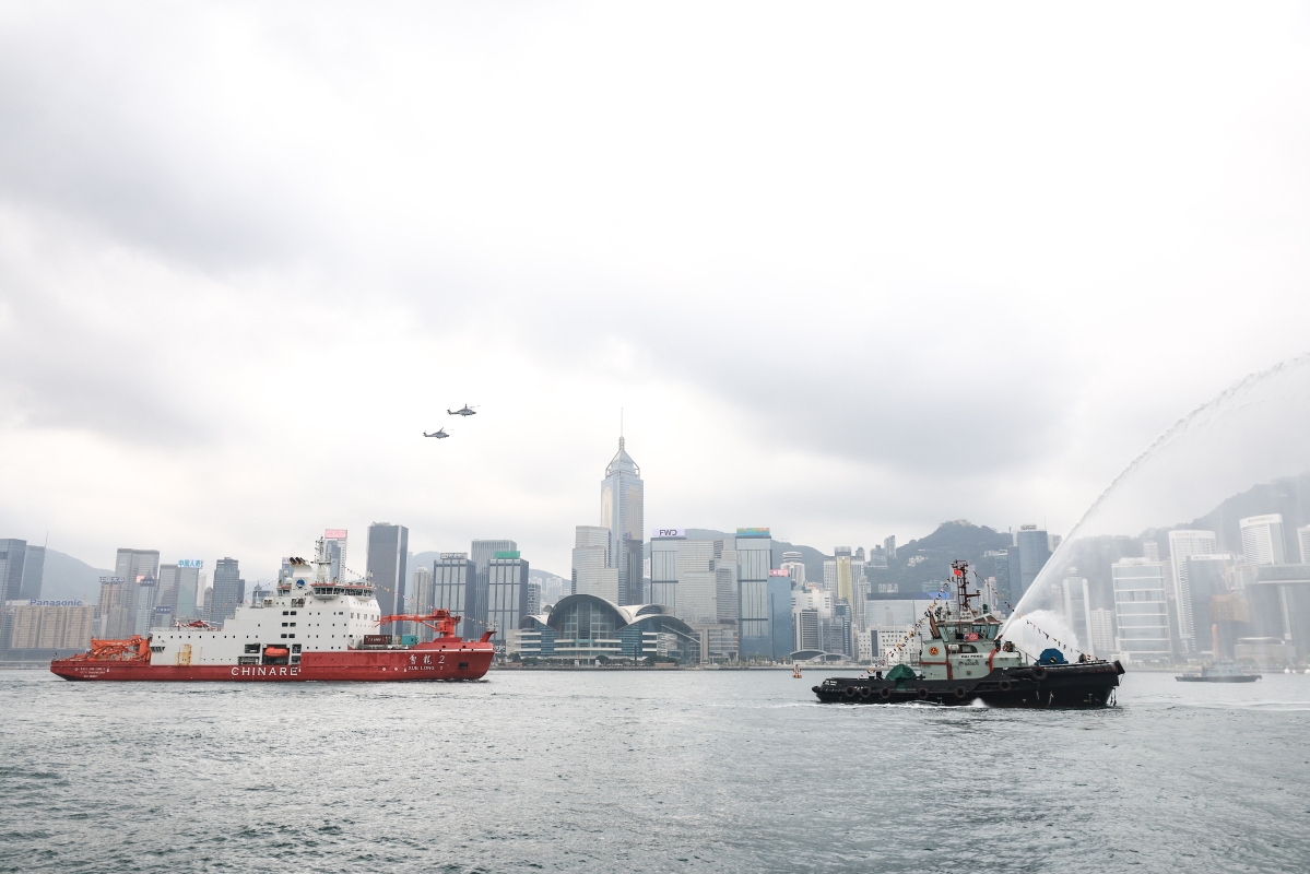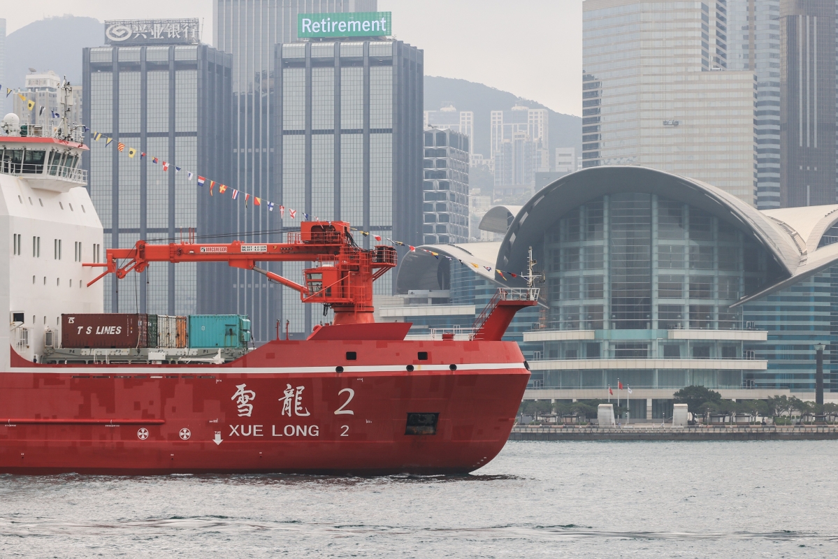 香港中通社圖片。 “雪龍2”號是中國繼“向陽紅10”號、“極地”號和“雪龍”號之後的第4艘極地科考船,排水量近1.4萬噸,總裝機功率23.2兆瓦,定員101人。“雪龍2”號其中一個最大的特色為其破冰能力,能破1.5米厚冰層,比“雪龍號”破1米厚冰層更強。 記者在尖沙咀碼頭看見,總長122.5米的“雪龍2”號在維港海面緩緩前行,體型龐大,在通過由兩艘拖船和一艘消防船對射形成的水拱門的同時,飛行服務隊兩架直升機低飛致敬。在歡迎典禮會場,警察銀樂隊奏樂歡迎“雪龍2”號;船上人員也站在船甲板圍欄邊向典禮現場揮手致意。