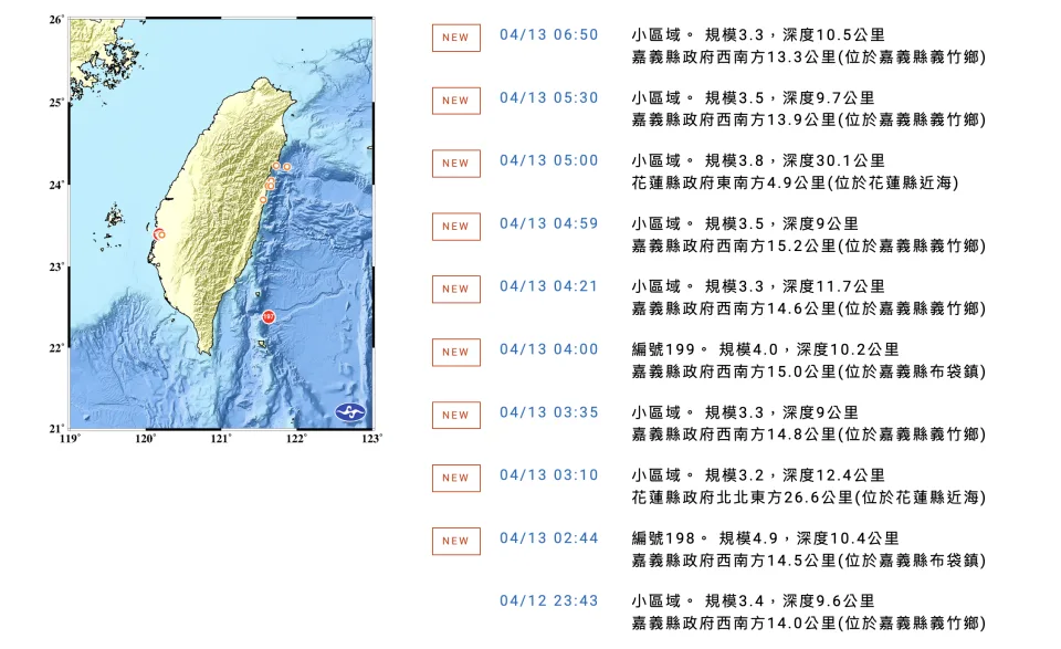 圖源:台灣“中央”氣象署 據報道,12日深夜11時43分,嘉義縣發生3.4級地震。截至13日早上7時,嘉義已發生8起地震。其中2起顯著有感地震的震中在嘉義縣布袋鎮,其餘6起小區域有感地震,震中在嘉義縣義竹鄉。 台灣氣象部門表示,研判地震發生原因是該區域的破碎帶所造成,與4月3日發生的花蓮大地震屬於兩起獨立事件。預計未來3到5天還會有小規模的地震發生。 嘉義縣政府稱,3月底已實施一次防災緊急動員,近日還舉行三合一防災演練,未來會不定期發布緊急防災動員令,做好防災準備。(完) 【編輯:彭玉婷】