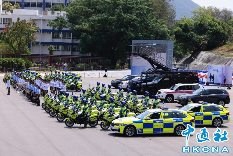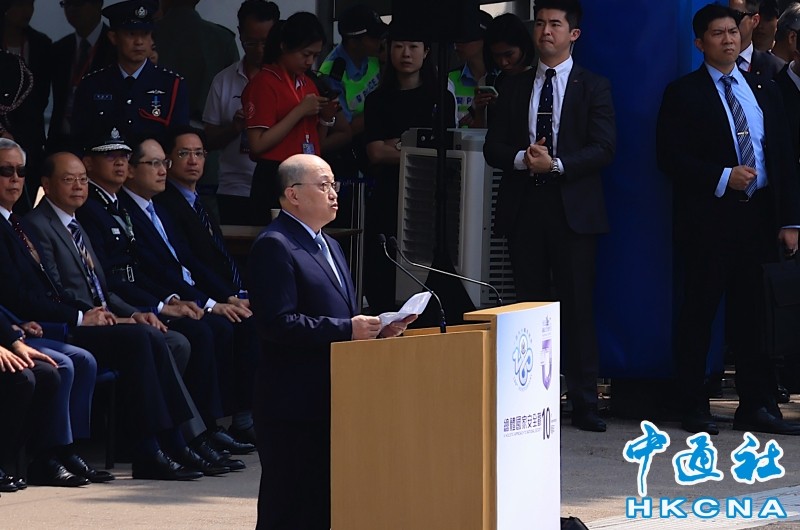 香港特區行政長官李家超致辭 香港中通社圖片 中央政府駐港聯絡辦主任鄭雁雄表示,香港特區警隊 “忠誠勇毅、心繫社會”,與特區的安全共榮辱,與市民的福祉同命運,是世界範圍極具敬業精神、專業素養、文明形象的警察隊伍,無愧於香港衛士、國家功臣、人民英雄的美譽。