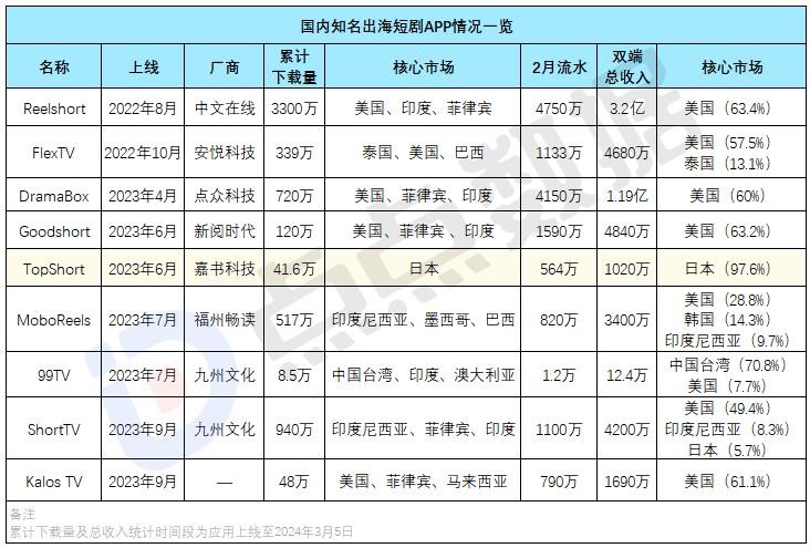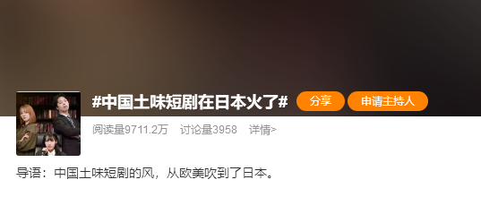 微博截圖 所謂“中國土味短劇”,主要是指單集時長幾分鐘的短視頻劇集,具有劇情狗血、題材土味的特點。 這些土味短劇,雖然被很多人吐槽演員演技拙略、服裝化妝道具粗糙又浮誇,但都絲毫不影響海外觀眾對它的喜愛,并且藉著短視頻平台流行之勢在海外網絡大殺四方。 據報道,今年2月,上海嘉書公司旗下的短劇APP TopShort,靠著頗受日本用戶喜愛的“大小姐文學”,在日本iOS應用暢銷榜排名一度超過Netfilix,累計下載量達到40萬。如今TopShort單月營收穩定在70-80萬美元之間,30倍碾壓日本本土的短劇APP。