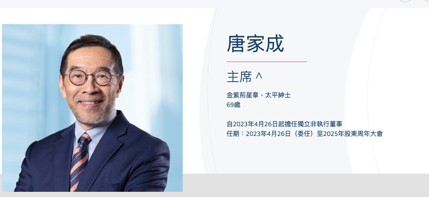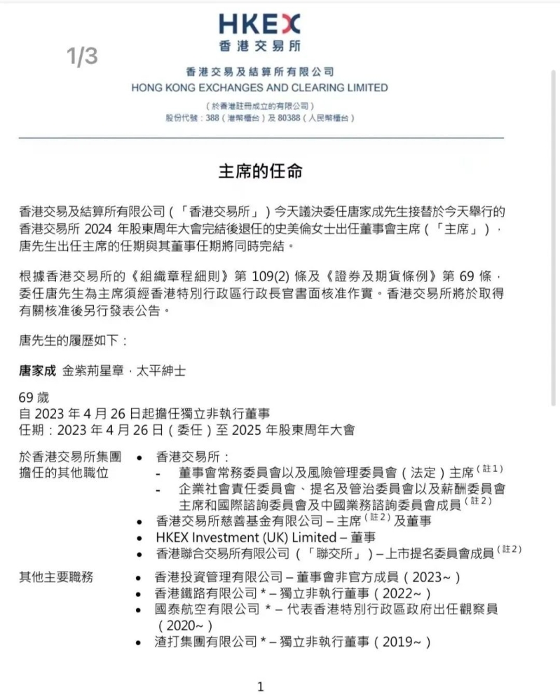 香港新聞網4月25日電 香港交易所發佈公告,決議委任唐家成接替史美倫出任董事會主席。公告稱,委任現年69歳的唐家成接替卸任的史美倫出任主席一職,任期由明(2024年4月26日)起至2025年股東周年大會完結,即任期只有一年。