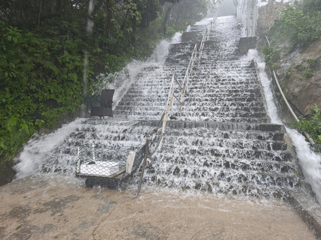 清水灣銀岬路一條樓樓梯,雨水如瀑布傾瀉而下。 (圖源:香港01)