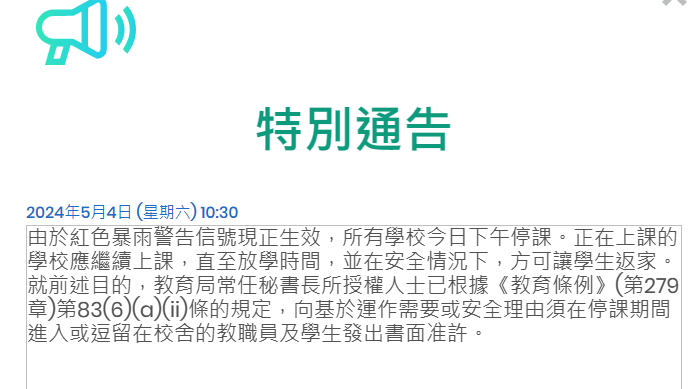 教育局通告。 香港天文台警示市民:暴雨警告信號現時為紅色,表示香港廣泛地區已錄得或預料會有每小時雨量超過50毫米的大雨,且雨勢可能持續。受大雨影響,會有山洪暴發,並且河道已經氾濫或可能會氾濫,市民應遠離河道。 今日(4日)凌晨近5時半香港天文台發出局部地區大雨提示,西貢區的雨勢特別大,並已錄得或預料會有每小時雨量超過70毫米的大雨,即達到黑色暴雨警告水平,有可能出現嚴重水浸,截至上午5時40分的過去一小時,將軍澳已錄得超過100毫米雨量,去到清晨6時許,寶順路近尚德邨往將軍澳隧道方向出現大型水氹;截至上午7時20分的過去兩小時,將軍澳已錄得超過150毫米雨量;在截至8時40分的過去一小時,將軍澳再錄得140毫米雨量。即早上累計已近400毫米。 又據香港01報道,受暴雨和水浸影響。將軍澳多條路受水浸及山泥傾瀉影響須全線或部份路段封閉,包括影業路、坑口道及環保大道等,九巴路線多條路線已暫停服務。去年9月因世紀暴雨封閉約半年才重開的耀東邨耀興道一帶,部份路段唯一行程線已封閉,城巴792M停駛。