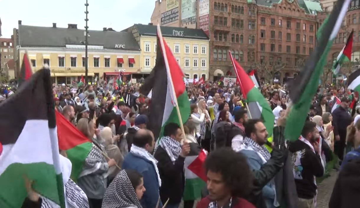 5月9日,上萬名示威者在瑞典馬爾默遊行,抗議以色列對加沙軍事攻擊。視頻截圖 數以千計民眾當日在瑞典港口城市馬爾默市政廳外聚集,遊行往比賽會場附近公園。有人高叫口號,揮動巴勒斯坦旗施放煙霧,反對以色列代表在加沙戰事持續下參賽。 現年20歲的以色列女歌手戈蘭自報名參賽後爭議不斷。早前有歌星聯署要求主辦方禁止以方參賽,主辦方以比賽屬非政治性質為由拒絕,但就要求更改參賽歌名和歌詞,因原本的參賽歌《十月之雨》,令人聯想到去年10月7日巴勒斯坦伊斯蘭抵抗運動(哈馬斯)突襲以色列。以方其後將歌名改為《颶風》參賽;她8日為準決賽綵排時更遭民眾喝倒彩。 去年10月7日哈馬斯對以色列發動突擊,造成超過1170人死亡,其中多半是平民。哈馬斯也擄走約250名人質,以色列估計仍有128人在加沙,包含官員說已經死亡的36人。突擊發生後,以色列隨即對加沙地帶發動反擊,根據最新資料顯示,以軍在加沙地帶的軍事行動已造成超過3.48萬巴勒斯坦人死亡、逾7.8萬人受傷。(完) 【編輯:梅婉潼】
