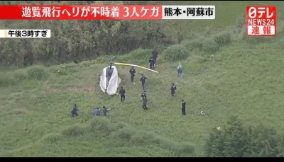 日媒報道截圖 香港入境處表示,在接獲相關求助後,已即時透過外交部駐港特派員公署及中國駐福岡總領事館跟進,並已按當事人意願提供適切意見及可行協助。 事發在昨(5月14日)日中午左右,直升機前往中嶽火山口等地觀光後,返回機場途中因引擎故障停止轉動,緊急迫降山區附近草地,事故造成50多歲日本男飛行員重傷,兩名香港遊客受傷,其中33歲女乘客腳部骨折、32歲男乘客臉部受傷。3人被送往醫院治療,全部清醒。 涉事觀光直升機的營運公司表示,此乃30多年來首次發生的意外。阿蘇卡德利動物樂園指出,受傷的2名旅客當時正參加從高空眺望阿蘇中嶽火山口的7分鐘觀光行程。 據瞭解,阿蘇火山觀光直升機以高空俯瞰阿蘇火山景觀為賣點,每日上午10:30至下午5:00營運,直升機每次最多可載3人。日本國土交通省將全面調查今次事故原因。(完) 【編輯:紀東】